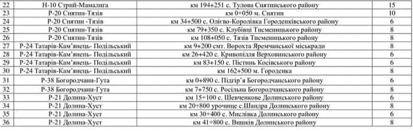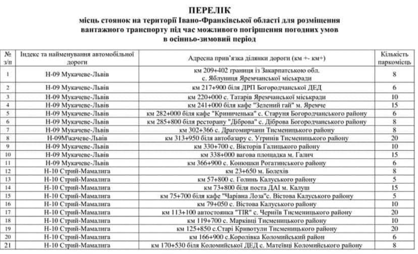 "Перелік місць стоянок на території Івано-Франківської області для розміщення вантажного транспорту під час можливого погіршення погодних умов", - йдеться у повідомленні.