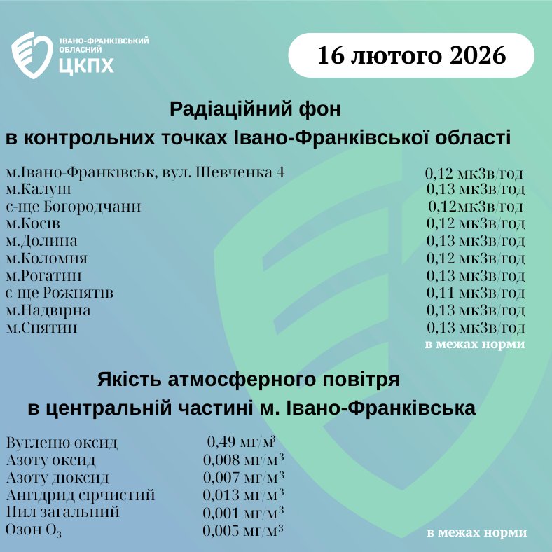 Станом на ранок 16 лютого показники радіаційного фону в Івано-Франківській області становлять 0,11–0,13 мкЗв/год.
