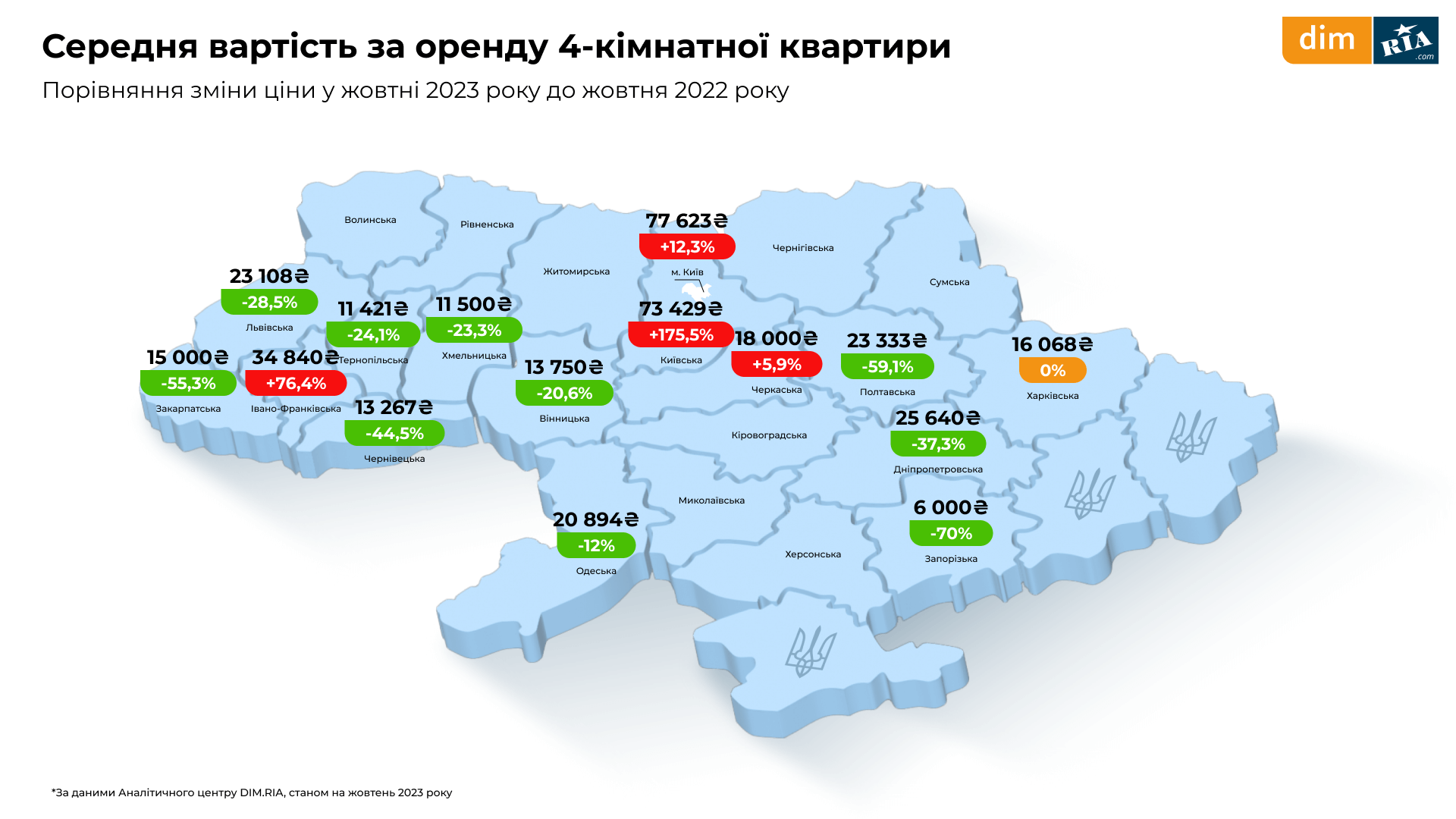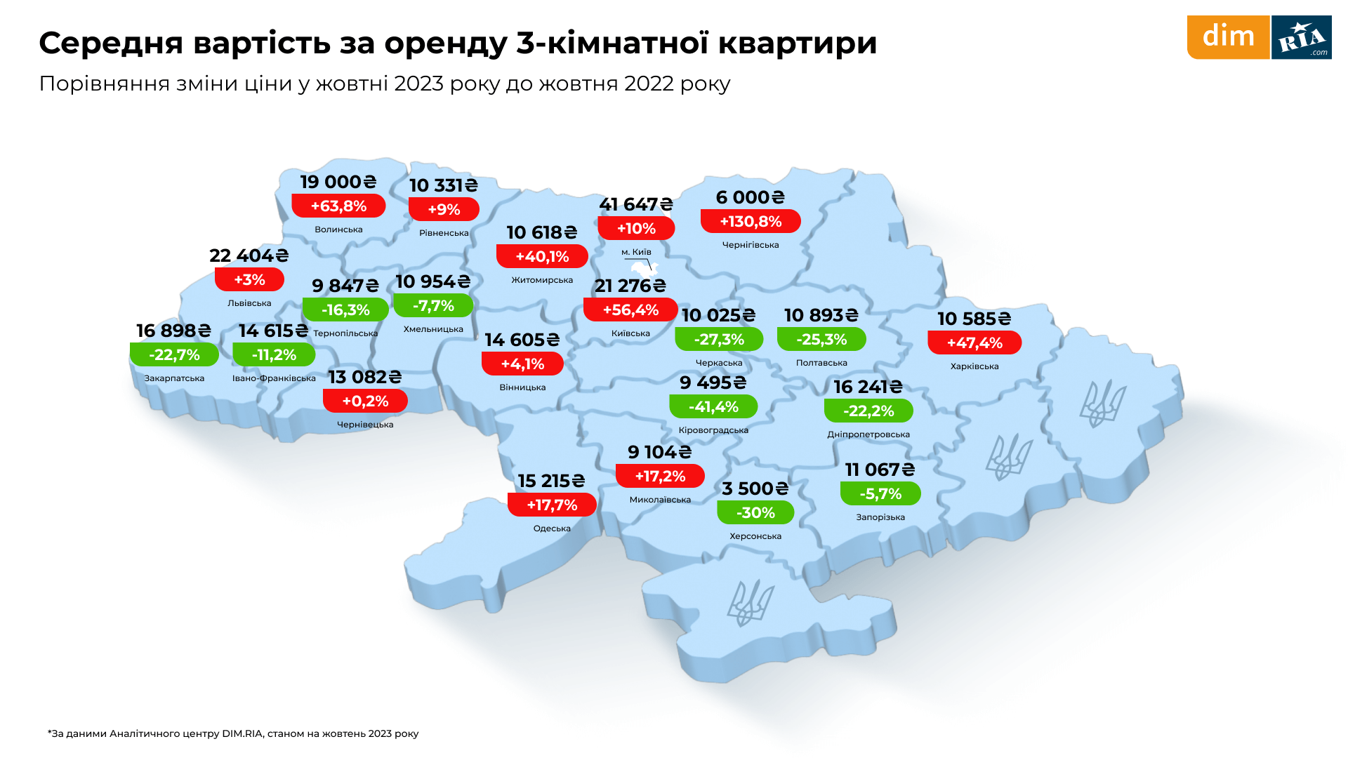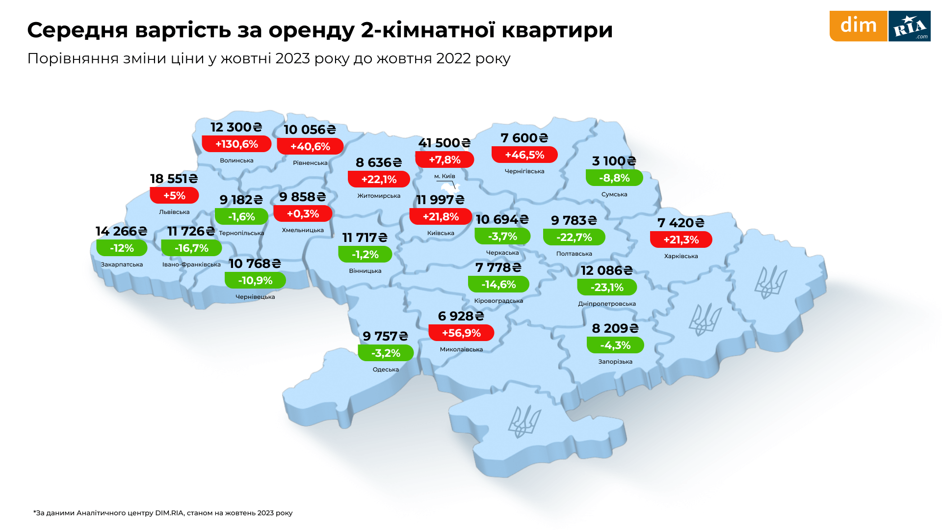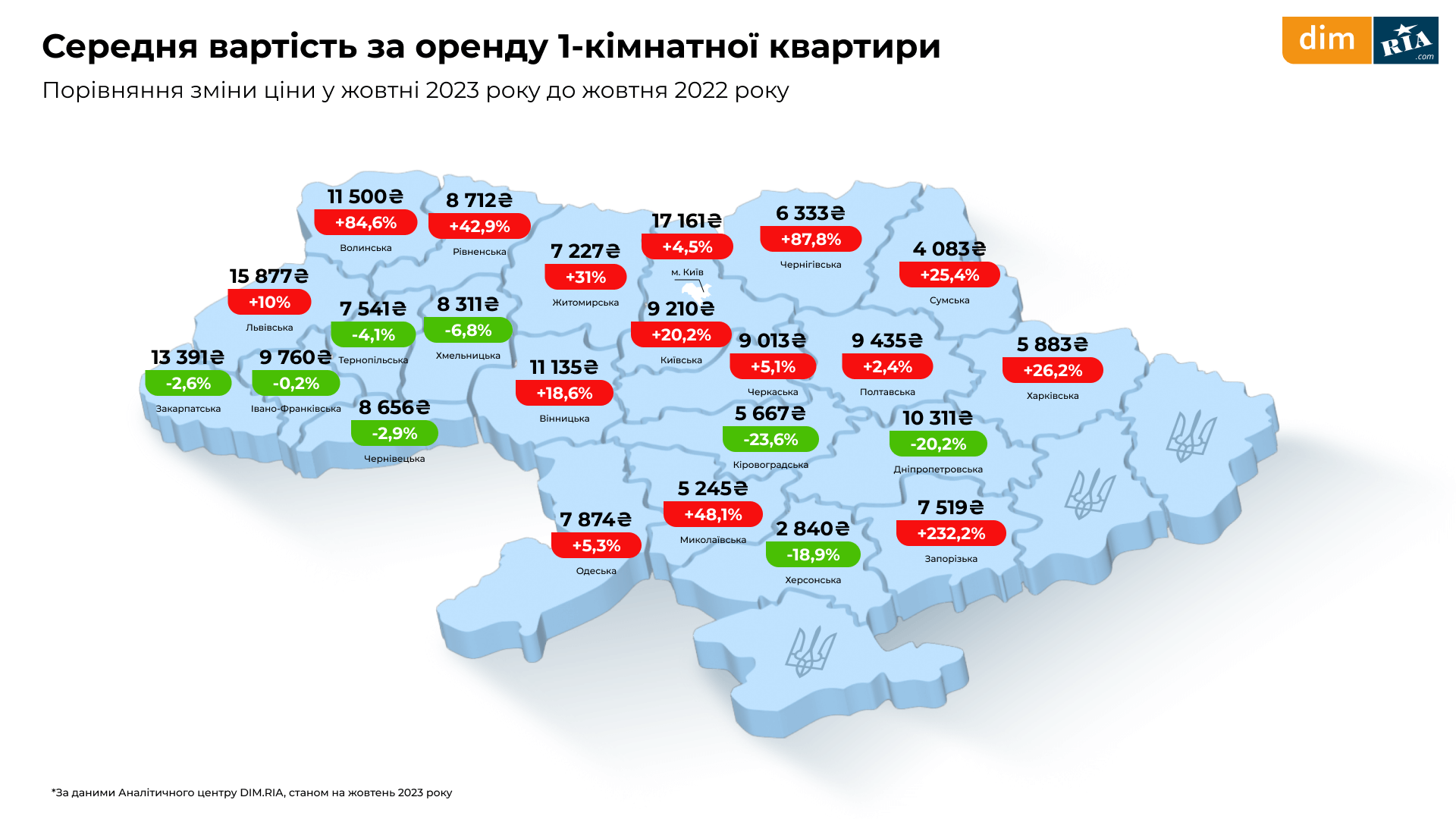 Станом на жовтень 2023 року ціна оренди однокімнатної квартири у столиці 17 161 грн, а в області — 9 210 гривень.