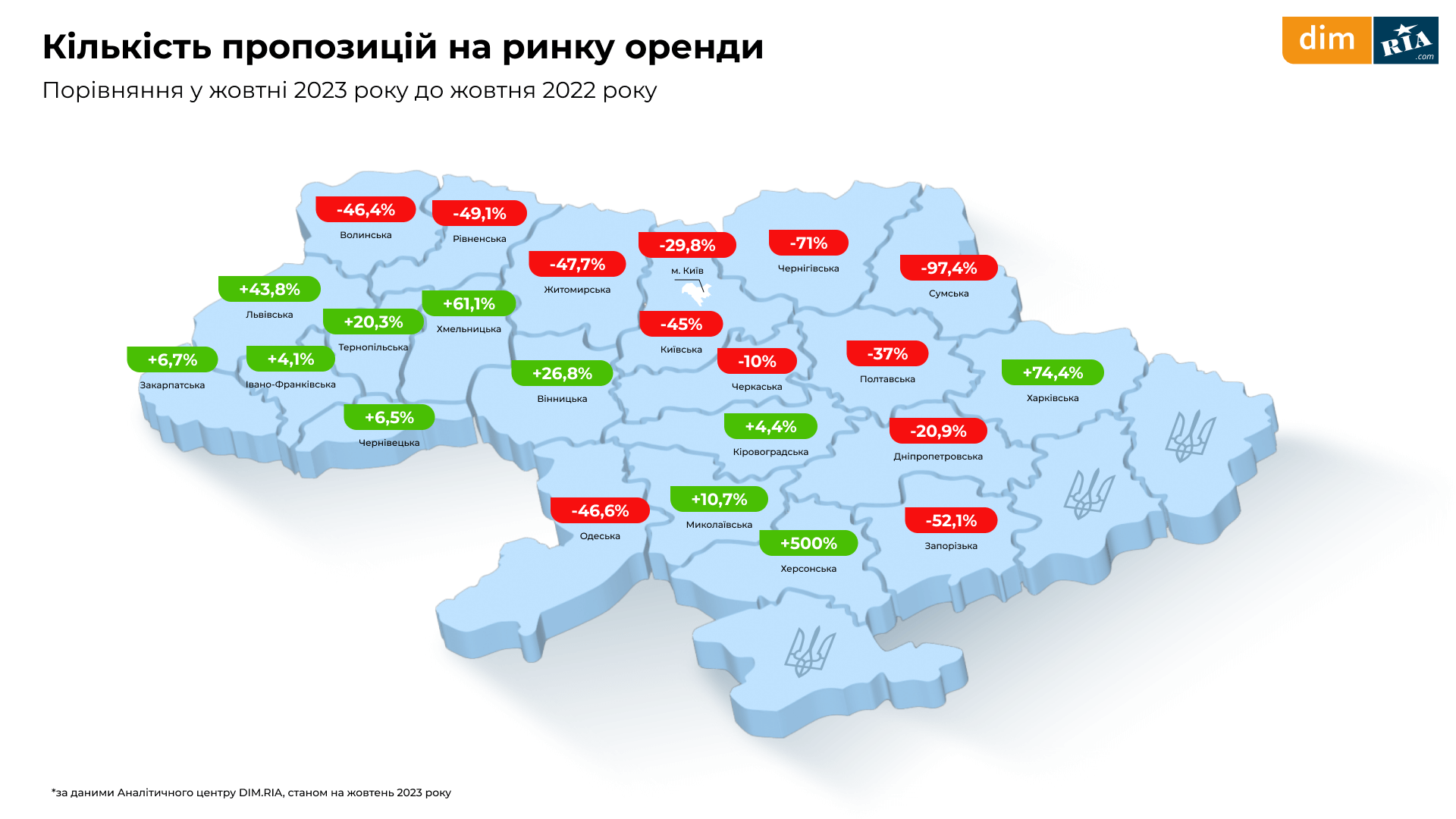Також аналітики зафіксували значне збільшення пропозиції у Чернівецькій області — на 90%, Закарпатській області — на 74%. Якщо аналізувати зміни у пропозиції за рік, то найбільше впала пропозиція у Сумській області — на 97%.