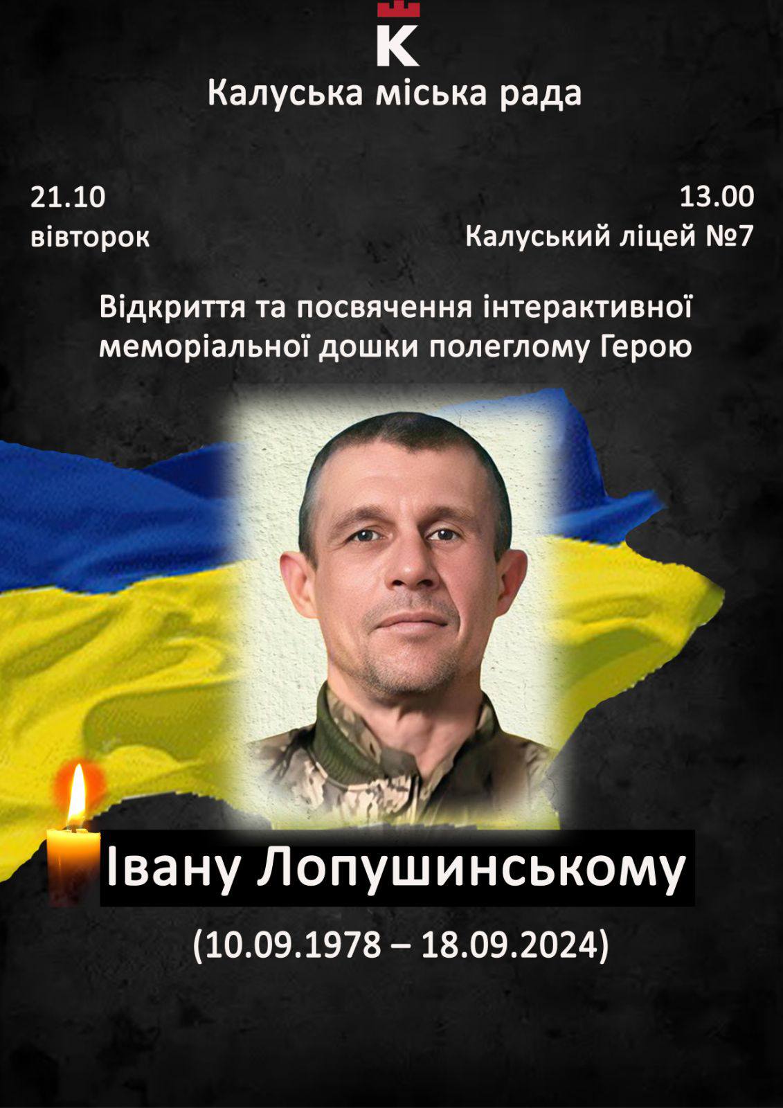 "Вшануймо своєю присутністю пам’ять полеглих Героїв. Відкриття та освячення інтерактивних меморіальних дощок відбудеться у вівторок, 21 жовтня, у Калуському ліцеї №7 (вулиця Хмельницького, 8а). Початок об 13.00 годині", — йдеться у дописі.
