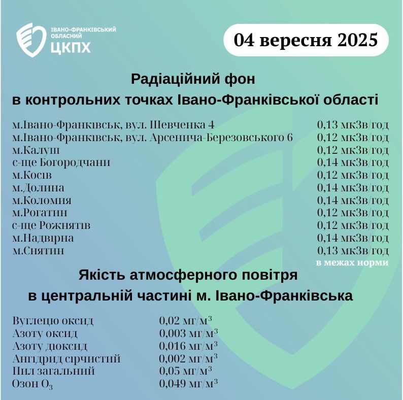 Станом на ранок четвертого вересня показники радіаційного фону в Івано-Франківській області становлять від 0,12 мкЗв/год до 0,14 мкЗв/год.