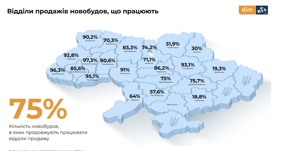 Так, як свідчать дані українського маркетплейса Dіm.Ria, на початку осені 2023 року в Україні працюють 75% відділів продажу новобудов, передає Фіртка.
