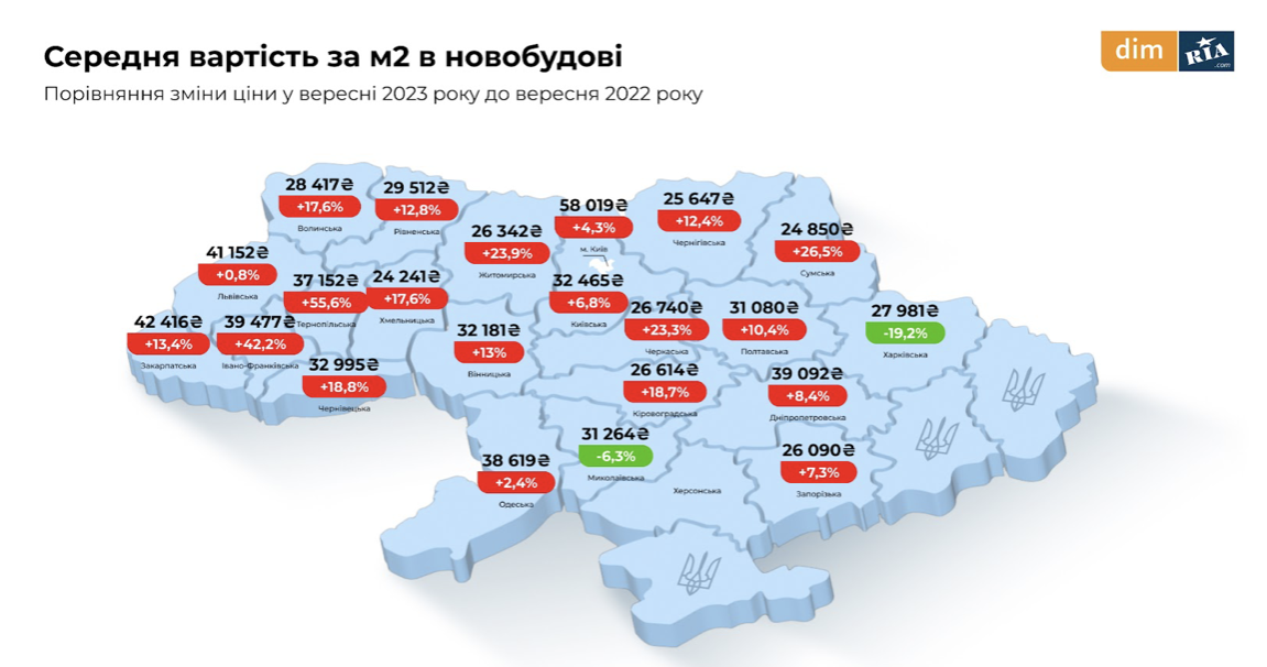 Найвища вартість спостерігається у Києві — 58 019 гривень (враховуючи всі типи квартир за кількістю кімнат). Якщо порівнювати середню ціну за м² у вересні до серпня, то вона зросла на 2%.