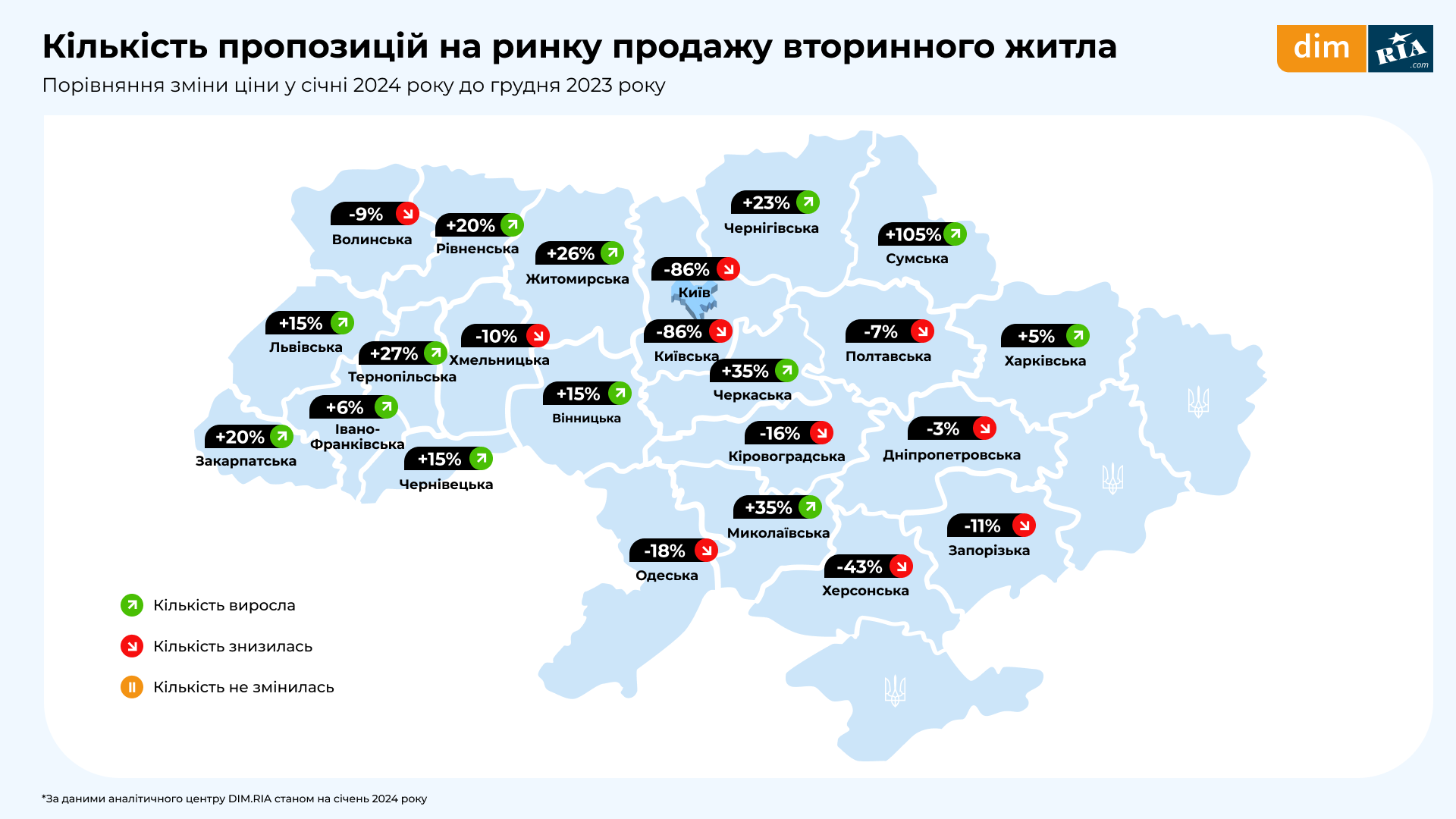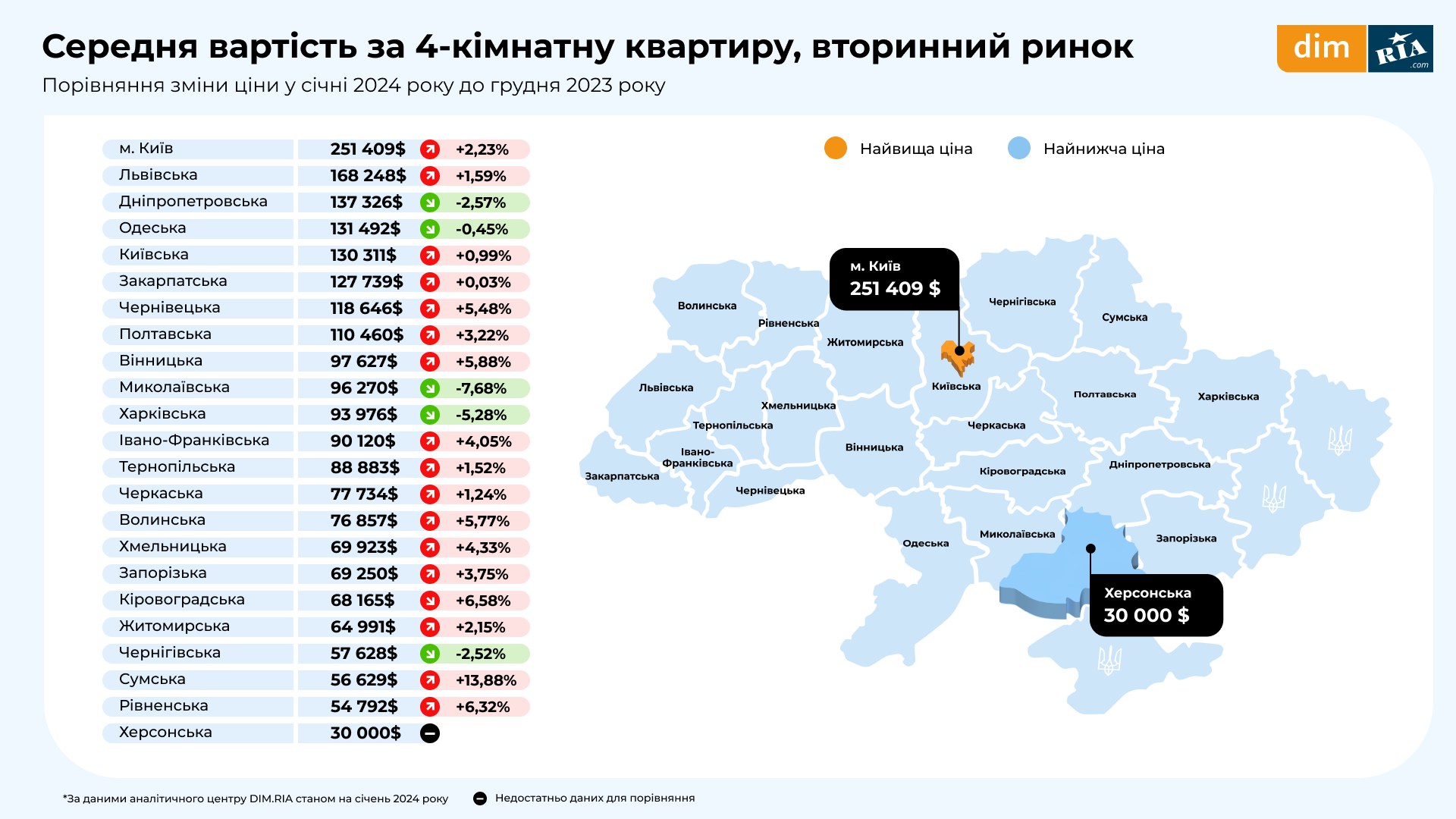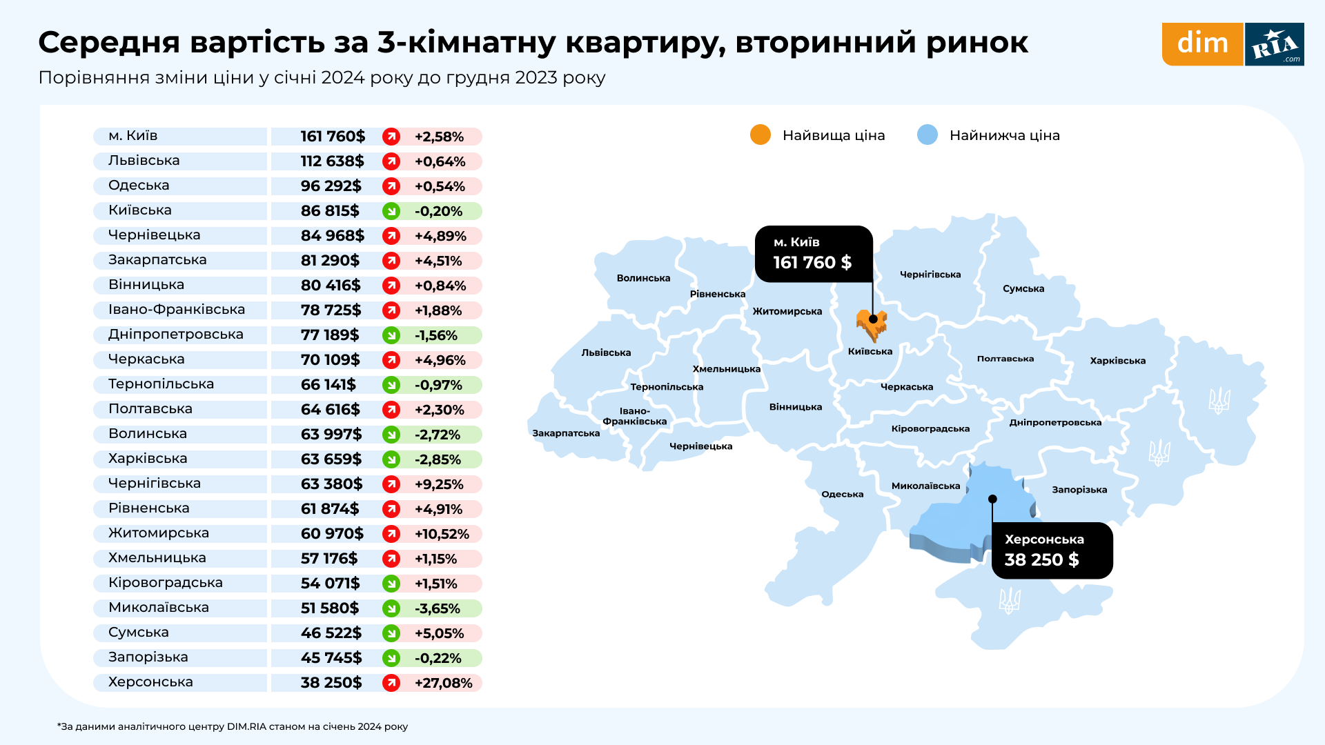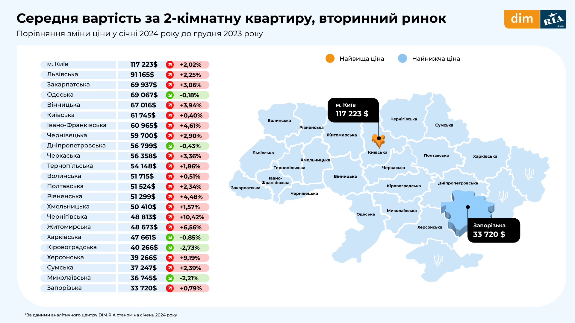Станом на січень 2024 року найбільше зростання середньої вартості на однокімнатну квартиру зафіксували в Івано-Франківській та Житомирській областях – на 5,5% та 7%.