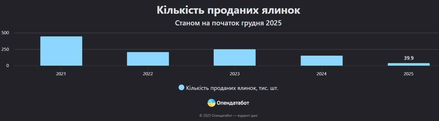 Утім попит на живі новорічні дерева падає ще швидше, аніж пропозиція. Так, лише 39,9 тисячі ялинок продали в Україні станом на середину грудня 2025 року.