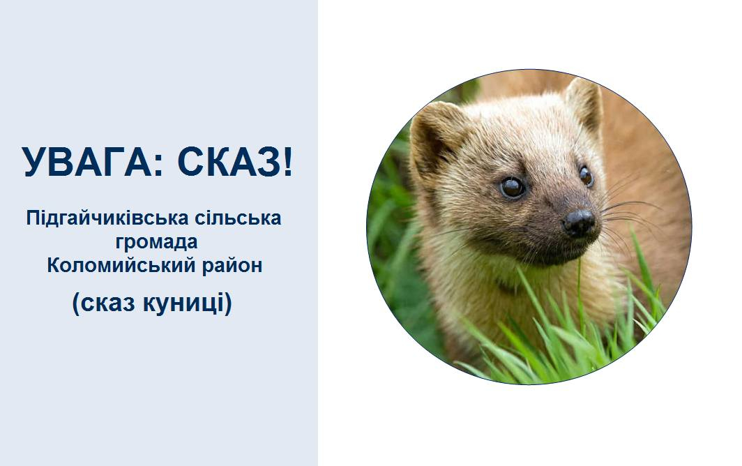 Івано-Франківською регіональною державною лабораторією Держпродспоживслужби встановлено сказ куниці, яка була в контакті з домашніми тваринами (нанесла покуси котам та собакам), в одному із особистих селянських господарств Підгайчиківської сільської громади Коломийського району Івано-Франківської області.