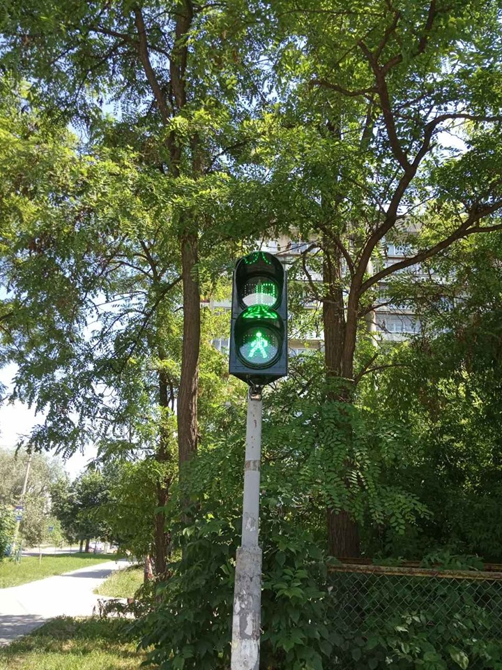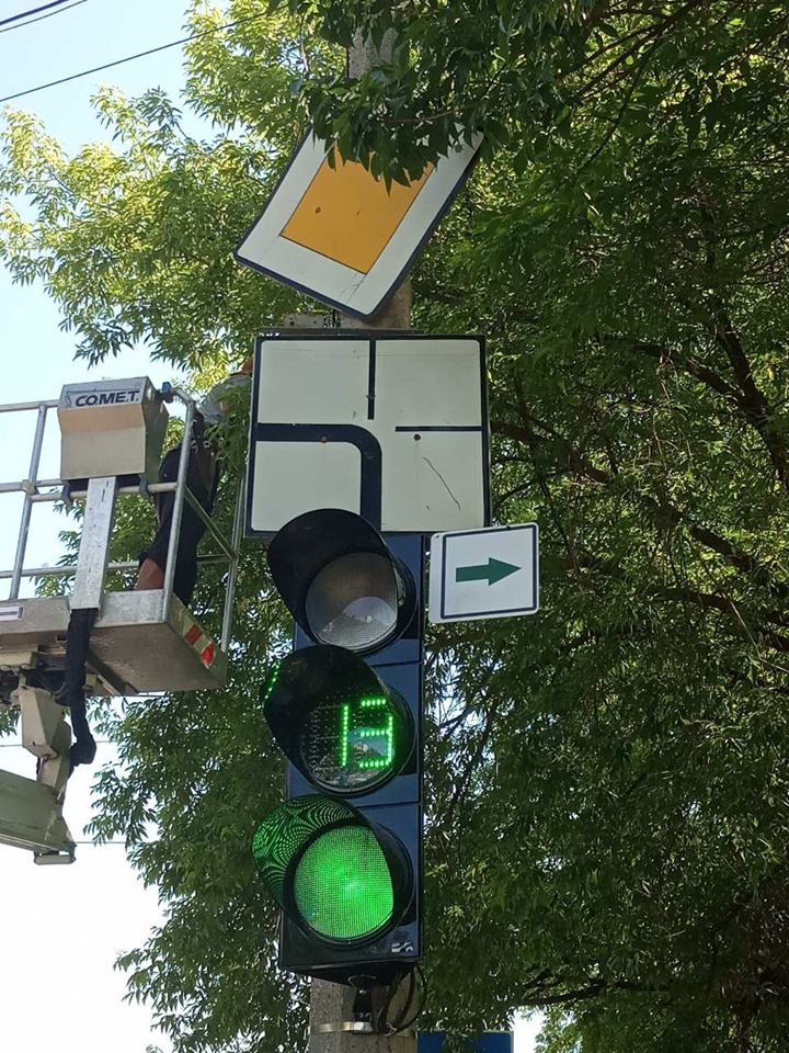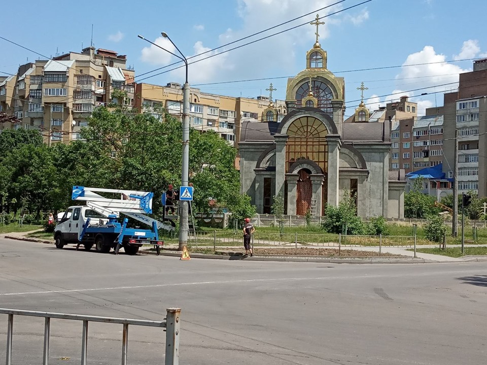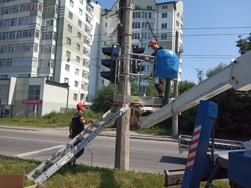 Замінено стару повітряну мережу, встановлено нові світлодіодні світлофори з відліком часу та встановлено три стійки для пішохідних світлофорів.