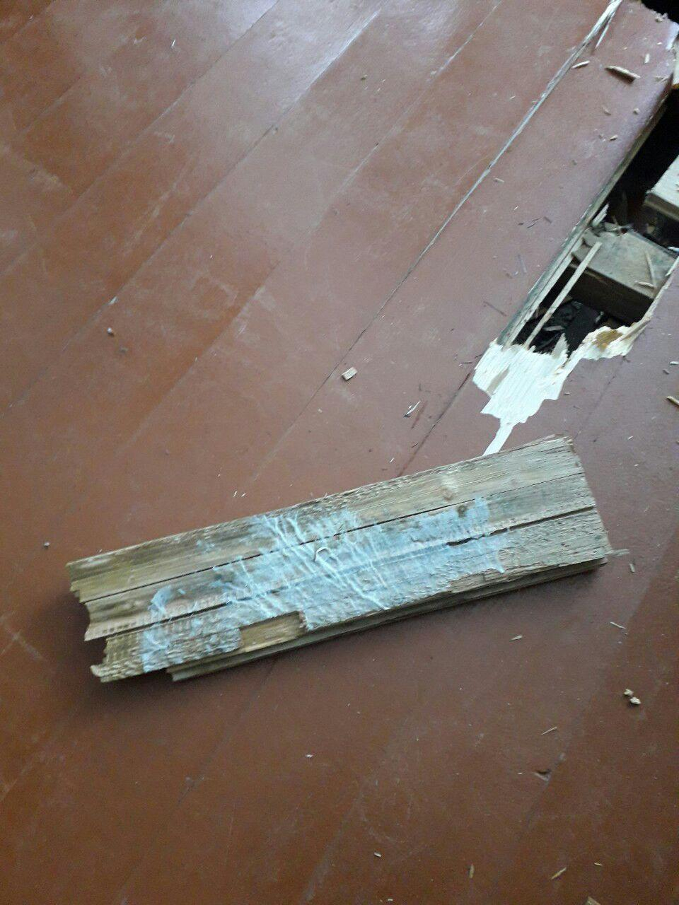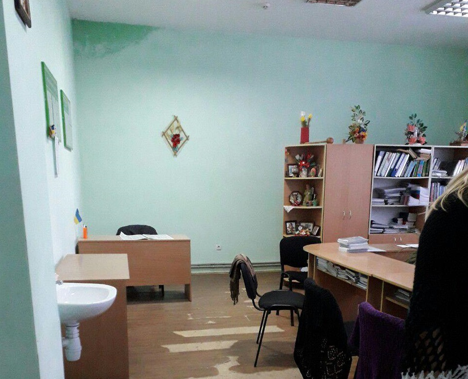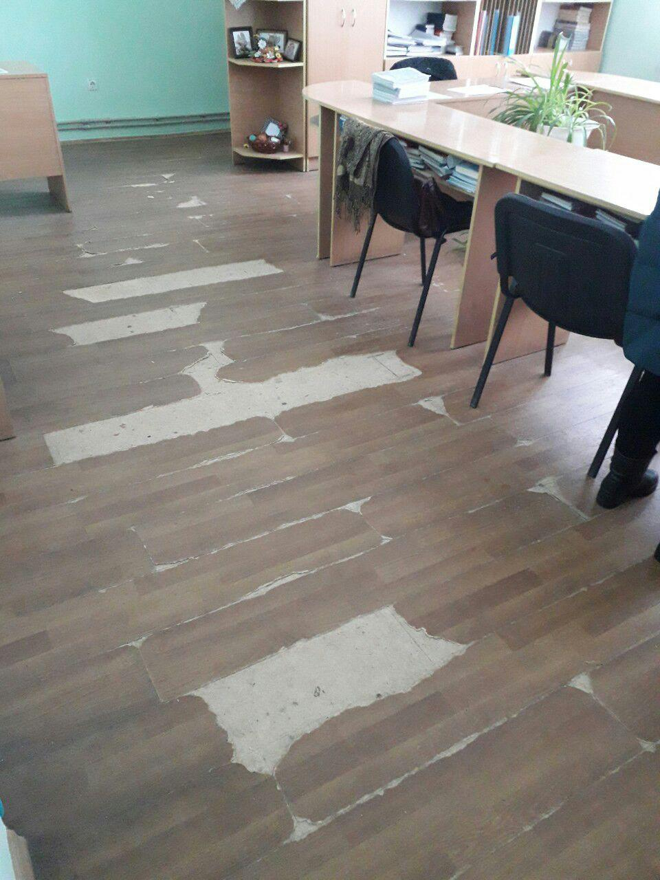 Під час вчорашніх оглядин, розповідають батьки, у школі виявили ще й прогнилу підлогу в актовій залі і навчальних класах, протікає дах приміщення , ламінат у жахливому стані, підлога в учительській повністю обдерта, а температура повітря у школі + 12 °C.