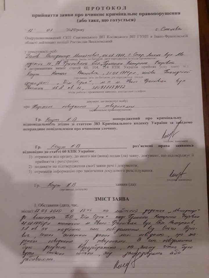 За фактом жорстокого поводження з тваринами відкрито кримінальне провадження за статтею 299 Кримінального кодексу України, інформує Фіртка з посиланням на обласну поліцію.