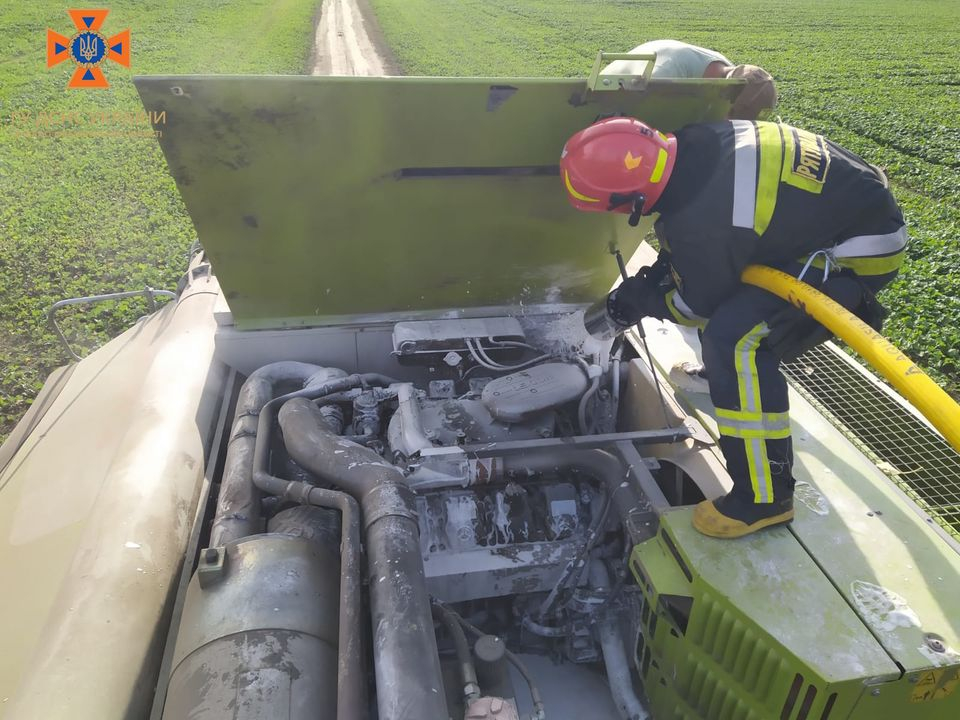 До місця виклику було направлено рятувальників 5-ї Державної пожежно-рятувальної частини. По прибутті до місця було встановлено, що горить моторний відсік комбайна на площі 2 м2.