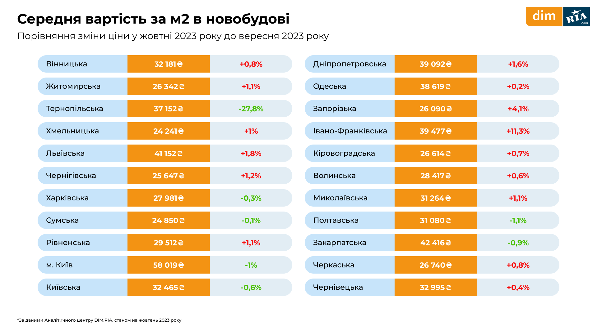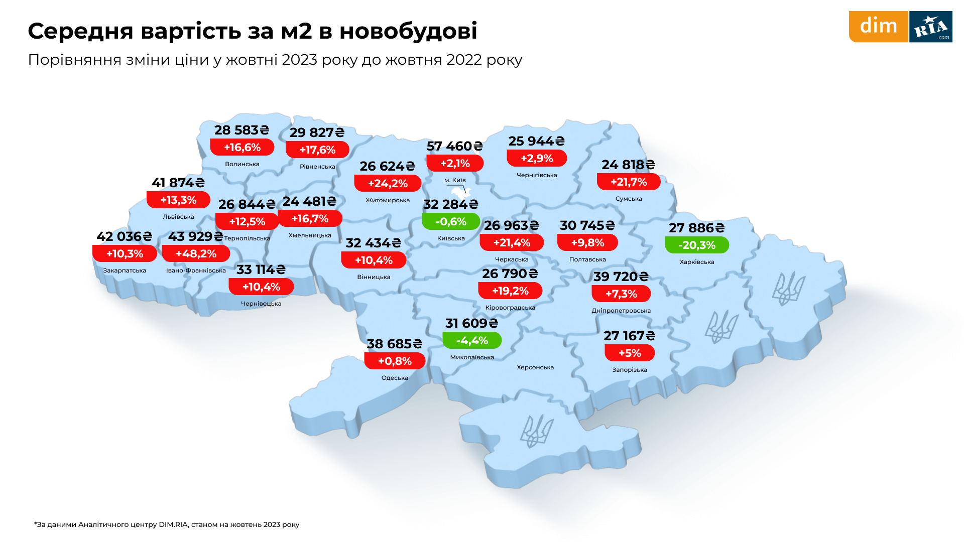 Станом на жовтень 2023 року найвища середня вартість за м² у столиці та складає 57 460 гривень (враховуючи всі типи квартир за кількістю кімнат).