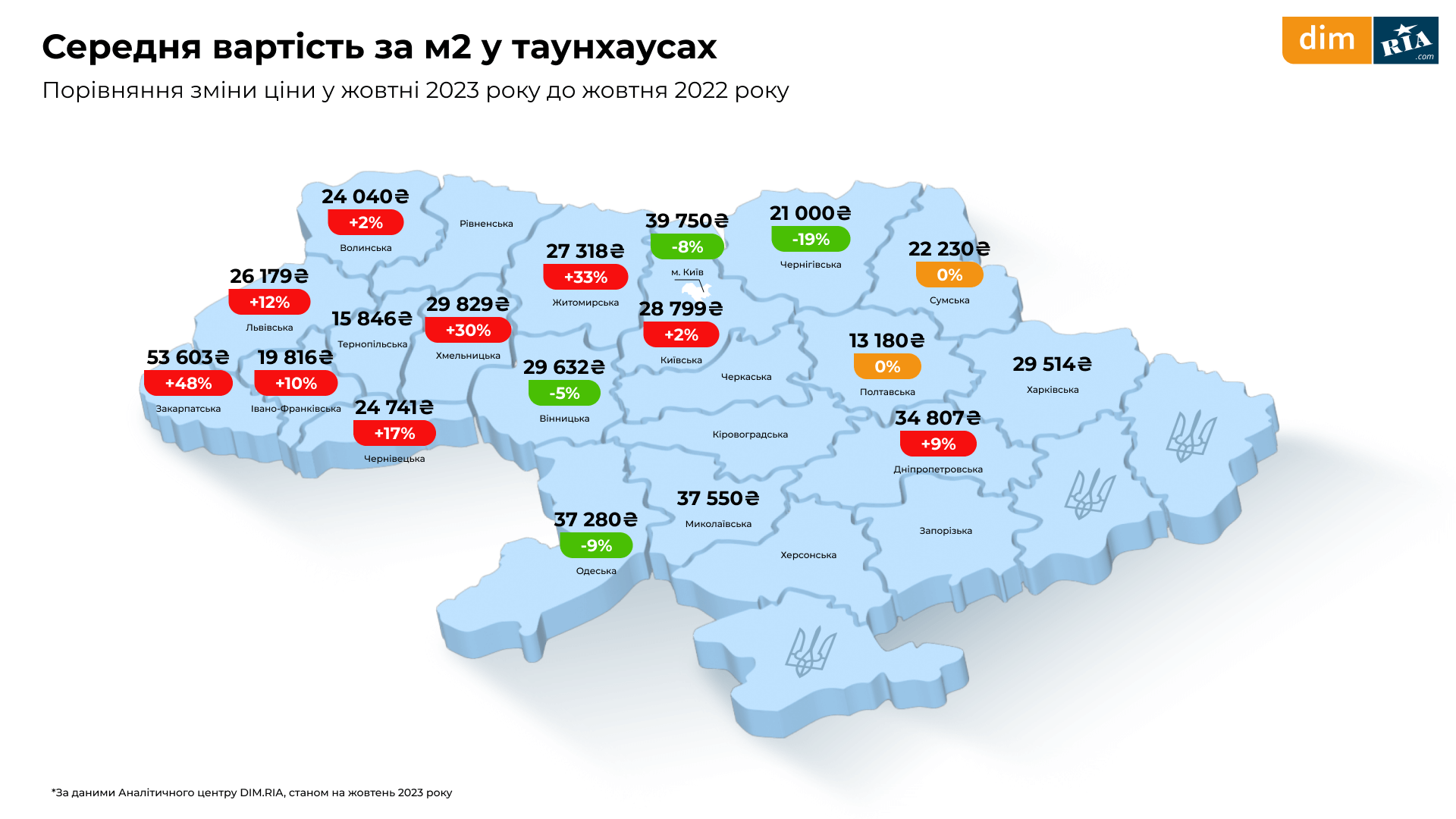 Дослідження середньої вартості за м² у таунхаусах показує, що найбільша ціна у Закарпатській області — 53 603 гривень і вона виросла на 48% до жовтня 2022 року.