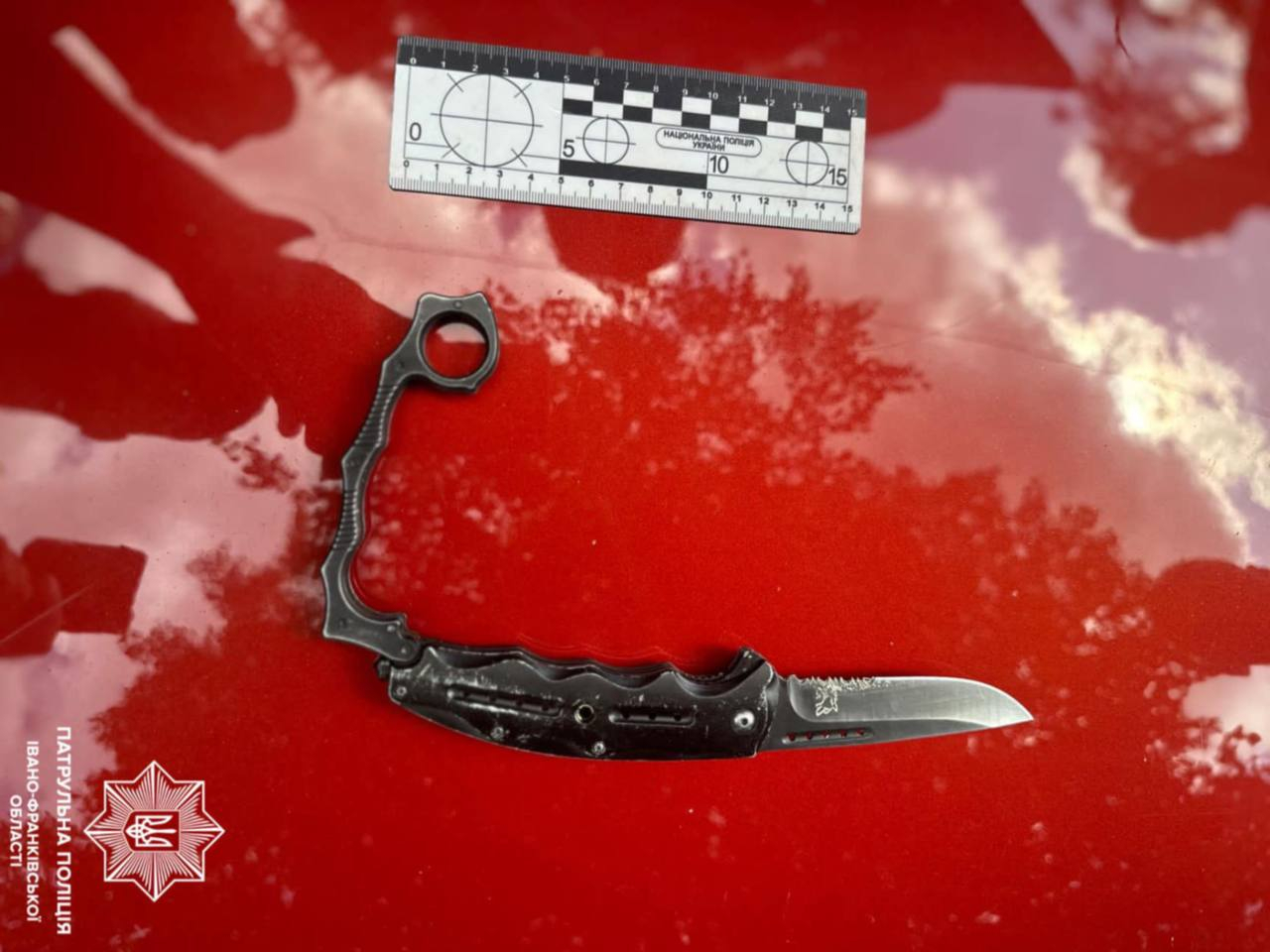 Інспектори згідно зі ст. 34 Закону України “Про Національну поліцію”, провели поверхневу перевірку та виявили у автомобілі ніж-кастет.