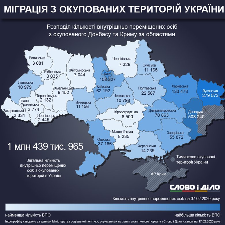 Аналітичний портал “Слово і Діло” відстежує динаміку змін у міграції населення з окупованих територій України. Так, за останніми даними, на початок лютого в Україні налічується 1 млн 439 тисяч 965 внутрішньо переміщених осіб, передає Фіртка.