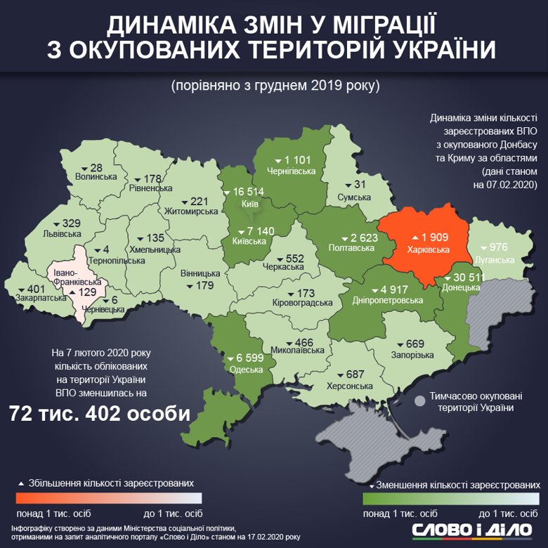 Кількість облікованих переселенців на початку лютого зменшилась на 72 тис. 402 особи порівняно з груднем 2019 року.