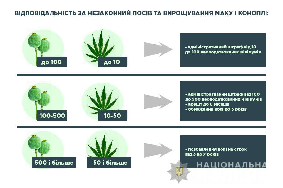А вже за незаконний посів або вирощування снотворного маку в кількості 500 і більше рослин або конопель у кількості понад 50 рослин передбачено позбавлення волі на строк від 3 до 7 років.