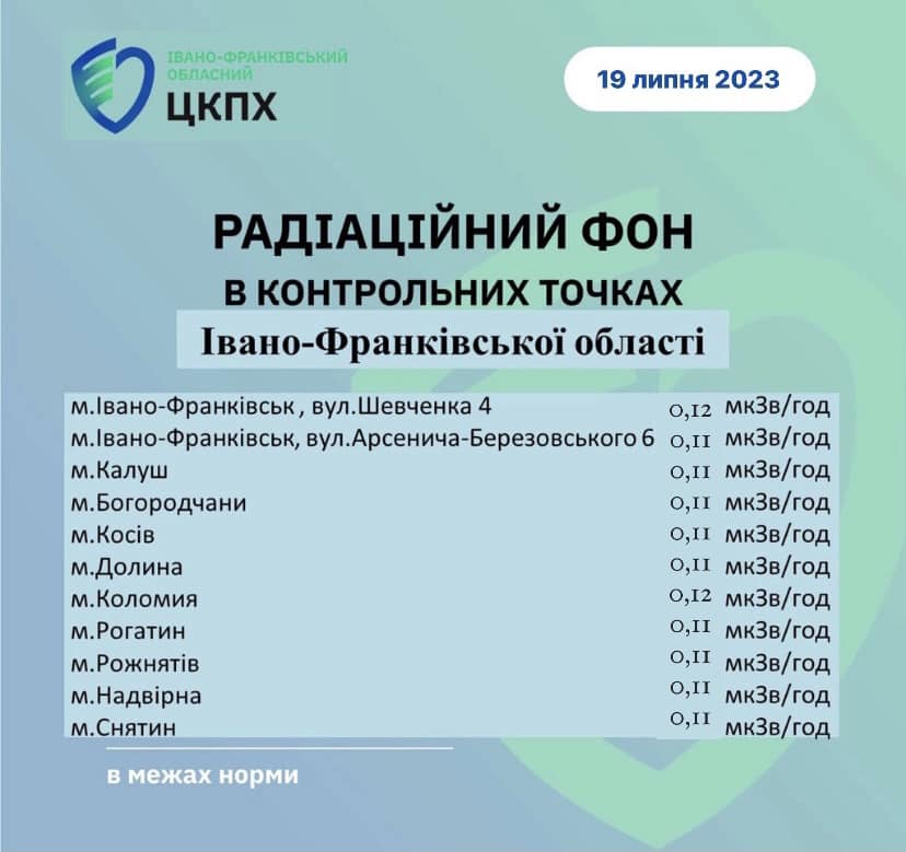 Станом на 19 липня показник радіаційного фону становить від 0,11 мкЗв/год до 0,12 мкЗв/год.