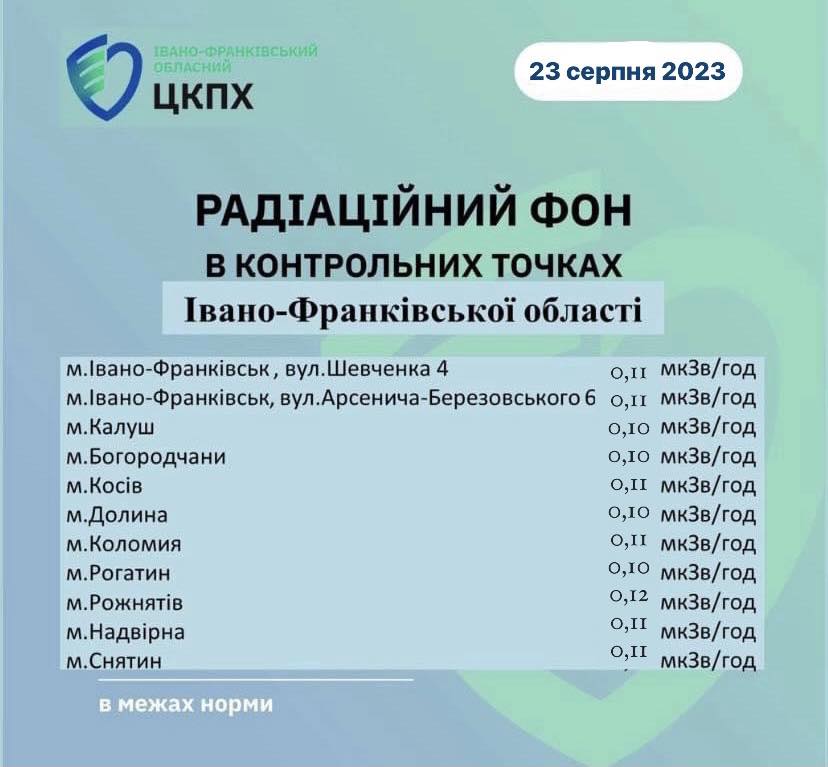 Станом на сьогодні, 23 серпня, показник радіаційного фону в Івано-Франківській області становить від 0,11 до 0,12 мкЗв/год.