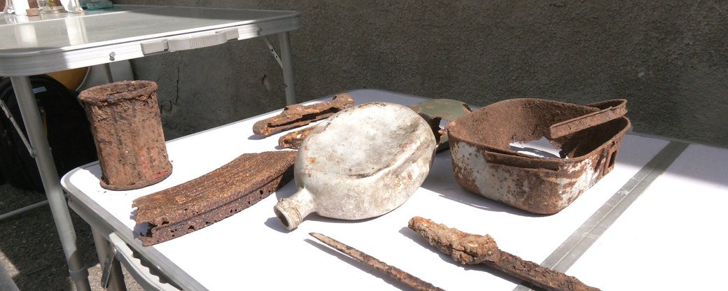Василь Тимків пояснює: "Ось це – фляга часів Першої світової війни так звана їдунка, миска для їжі - похідний варіант. В дальній частині стола знаходяться фрагменти від різної зброї, яка, ймовірно, використовувалася повстанцями, тому що це фрагменти мисливської зброї і не тільки. Одним словом, це говорить про те, що українські повстанці використовували ту зброю, яку могли здобути".
