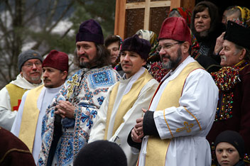 Дзень-дзелень-дзінь-дзень. Один за одним з церкви виходять чоловіки і шикуються в ряд. Одягнені всі приблизно однаково. У колядників по вишитих сорочках — яскраво вигаптувані кептарі, зверху — багато оздоблені на грудях, прикрашені кутасами темно-бордові сердаки, штани заправлені у високі чоботи. Дехто тримає в руках гуцульські топірці-бартки, ще хтось несе на плечах трембіту чи мисливський ріг, кілька чоловіків — зі скрипками. До зап’ястя правиць прив’язані дзвоники. Попереду кожної колядницької ватаги — її керівник. Ватажки заспівують, пісню підхоплюють інші члени гурту — так починається урочистий хід довкола церкви.