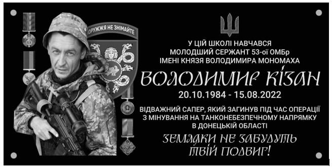 Пам’ять сучасного Героя Володимира Кізана, котрий загинув у боях з московською ордою, увіковічнять меморіальною дошкою. Встановлять її на фасаді Васючинської гімназії імені Романа Левицького нашої громади.