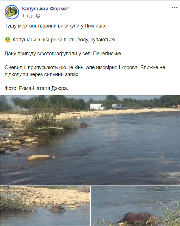 Очевидці припускають що це кінь, але ймовірно і корова. Про це пишуть у Фейсбук-спільноті “Калуський формат“. У мережі обурюються, що з цієї річки п’ють воду, купаються.