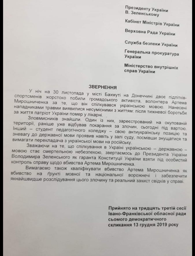 «Ми вважаємо неприпустимим, що українця на українській землі вбивають за українську мову. Важливо, щоб українці зрозуміли всю трагедію цієї справи, адже більш, як 14 тисяч українців уже загинули на сході країни. Щодо тих людей, які вбили Артема Мірошниченка, вони обоє підлітки, неповнолітні, тому суд проводиться у закритій формі. І ми про все дізнаємося по факту. Але важливо говорити про те, що один з них під час суду продовжує зневажати українську мову, говорить, що не розуміє її», - зазначив ініціатор звернення депутат Михайло Королик.