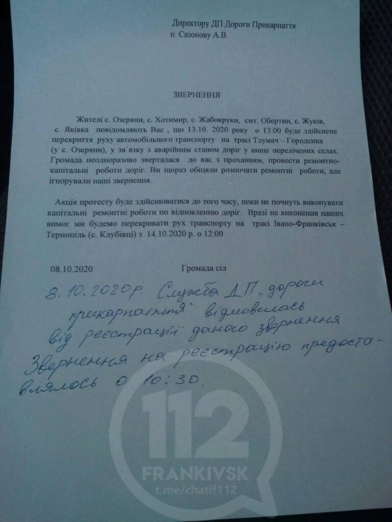 Сьогодні, 13 жовтня, люди частково перекрили рух транспорту. Мешканці села Озеряни та навколишніх сіл Тлумацького району частково перекривали дорогу регіонального значення Р-20 «Снятин-Тязів», інформує Фіртка з посиланням на обласну поліцію.