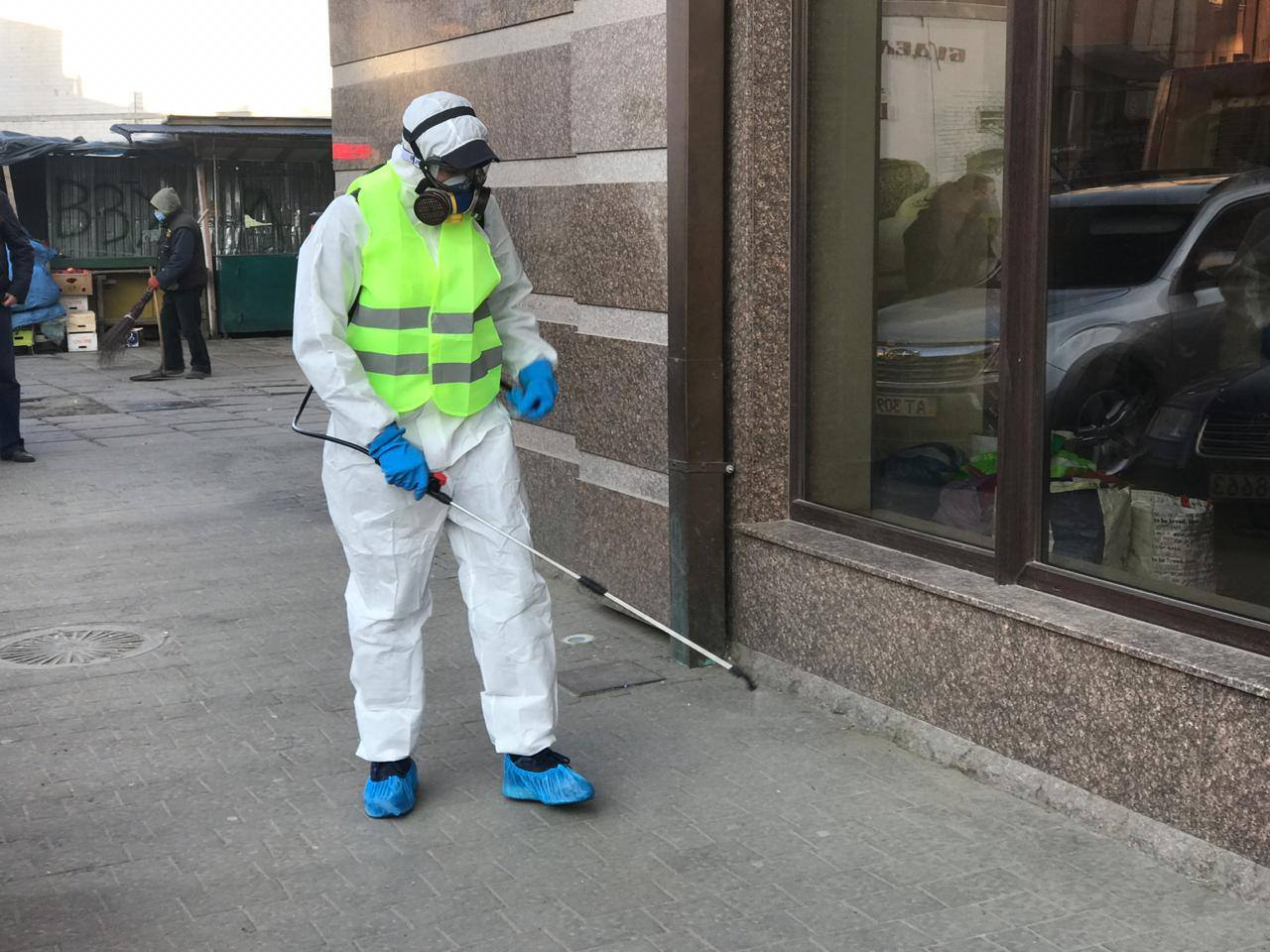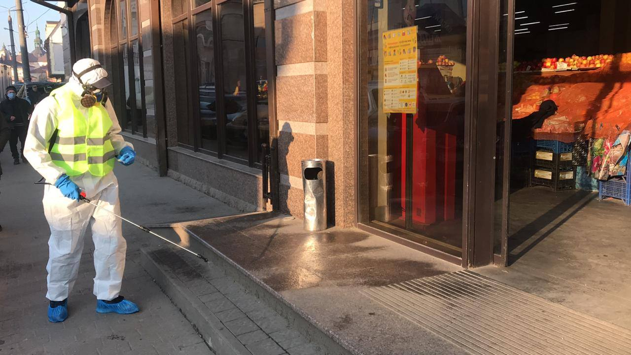 Сьогодні, 17 березня, перед початком робочого дня, на території Центрального ринку Івано-Франківська фахівці у спецодязі провели санітарну обробку, використовуючи спеціальні дезінфікуючі засоби.