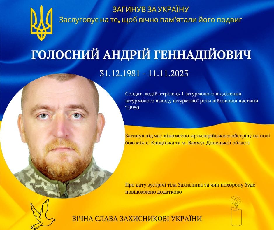 В бою за Україну під час мінометно-артилерійського обстрілу неподалік Бахмута загинув ще один мешканець Долини Андрій Голосний.