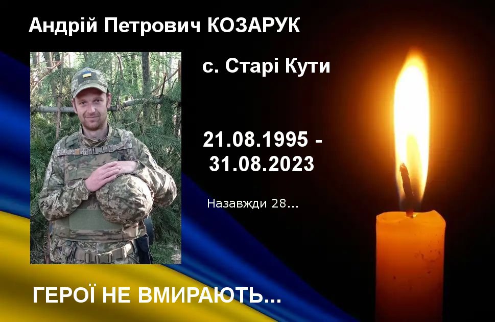 На війні з російським окупантом, відданий Військовій присязі на вірність Українському народу, мужньо захищаючи рідну землю від загарбників, 31 серпня 2023 року, під час артилерійського обстрілу в районі населеного пункту Бахмут Бахмутського району Донецької області, поліг Герой Андрій Козарук. Герой народився 21 серпня 1995 року, житель села Старі Кути, уродженець Коломийщини. Солдат, стрілець - снайпер. Йому було лише 28.