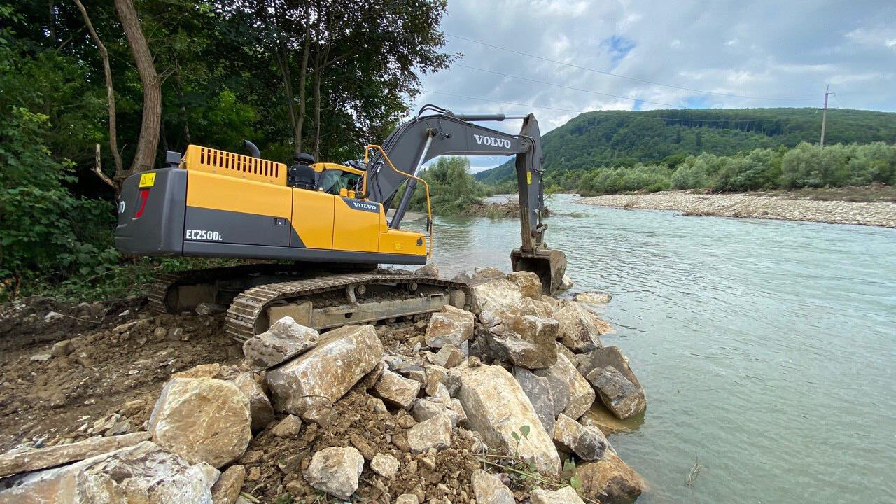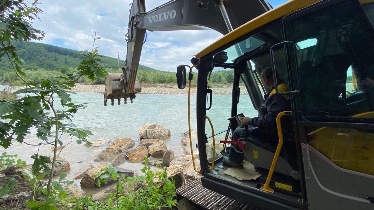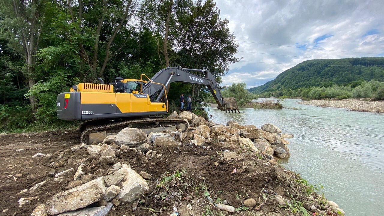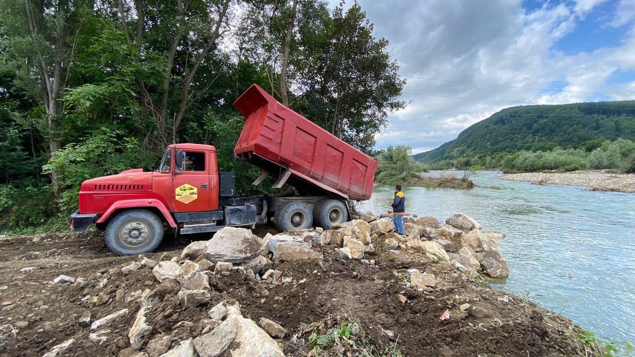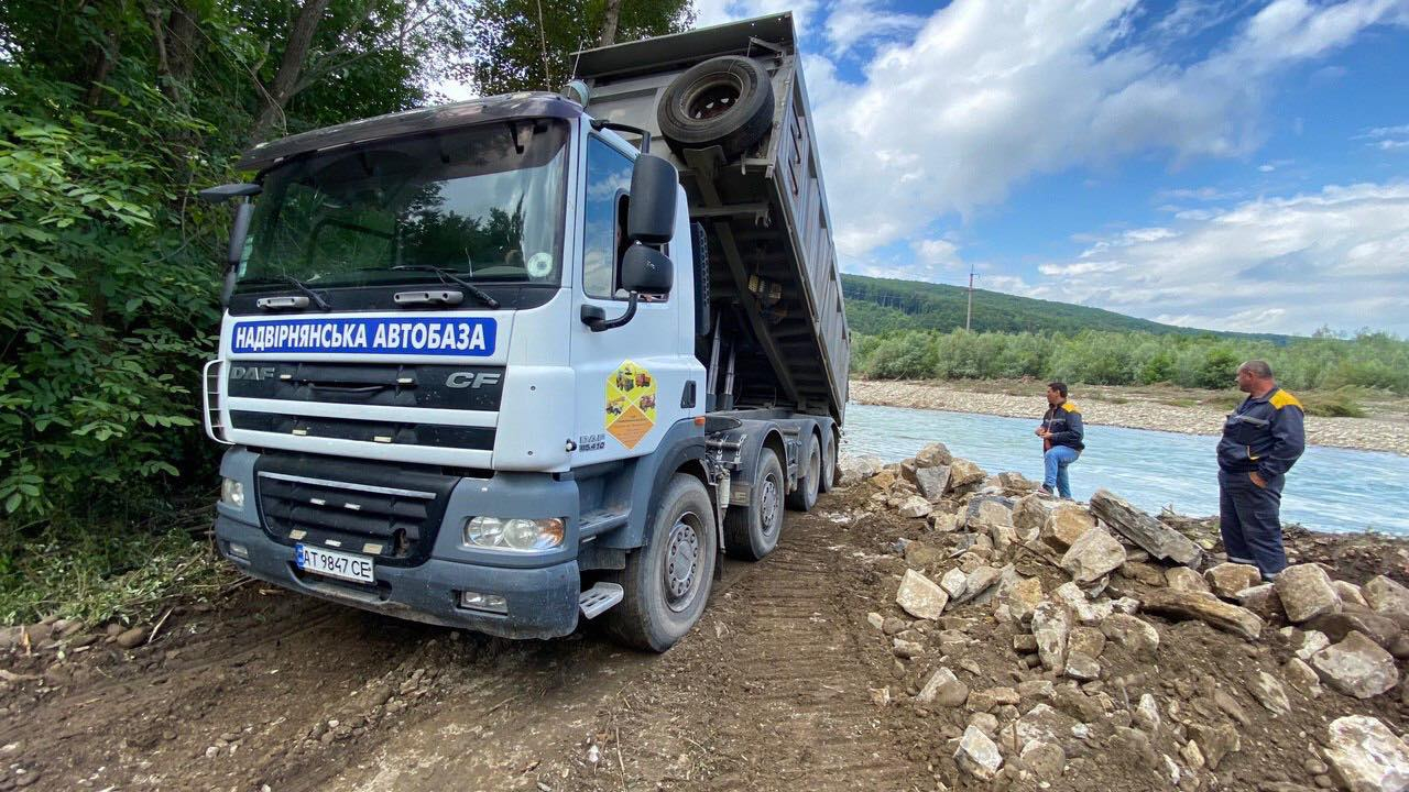 На звернення обласної та районних рад ТОВ "Надвірнянська автобаза" розпочала роботи по укріпленню дамби.