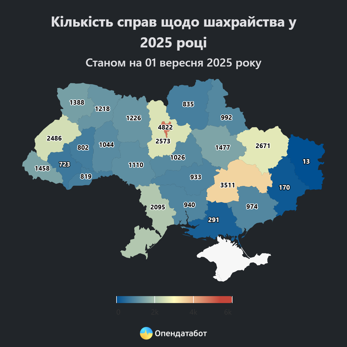 Найбільше звернень щодо шахрайства цьогоріч у столиці — 4 882 справи. Наслідує Дніпропетровщина — 3 511 проваджень та Харківщина — 2 671. Найменше всього проваджень, окрім тимчасово окупованих територій та зони бойових дій, зафіксували на Івано-Франківщині — близько 700 справ.