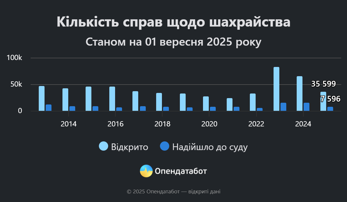 За вісім місяців 2025 року в Україні відкрили понад 35 тисяч кримінальних проваджень за ст. 190 ККУ «Шахрайство».