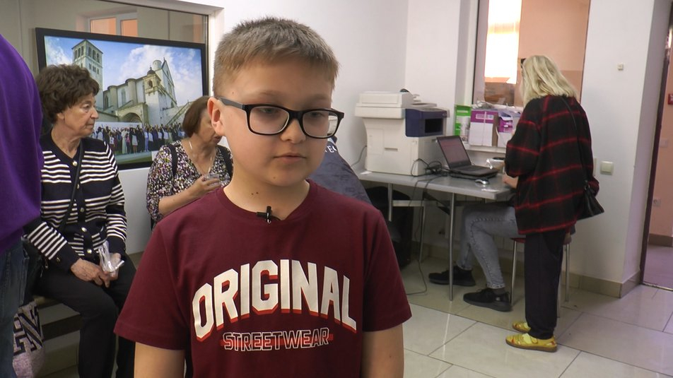 9-річний волонтер не тільки роздає допомогу, але й підіймає настрій, каже Тетяна Петренко. Жінка переїхала з Харкова. Вона вперше прийшла за гуманітарною допомогою у "Спільноту святого Егідія".