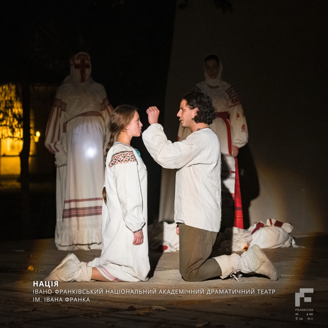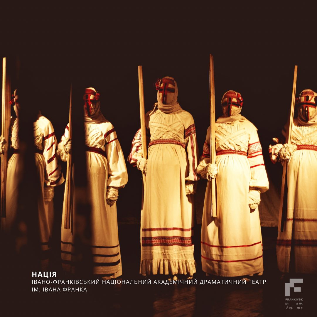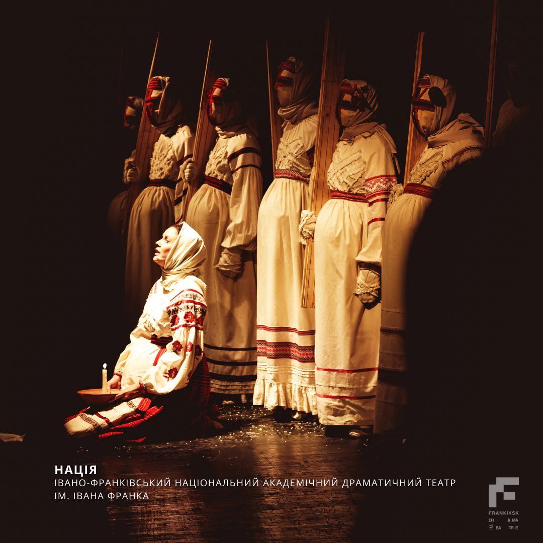 Довідково: "Нація" - вистава на основі реальних подій 40-х років XX сторіччя на скривавленій Гуцульщині. Молитва-реквієм у містичному коловороті розкриває незагоєні рани давно минулого, дарує сповідь та прощення "своїм" та "чужим", "невинним" та "винним" мученикам історії. Бо тільки з любові та у муках народжується нове чисте життя. Народжується НАЦІЯ!