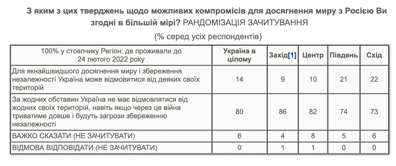 Водночас серед мешканців Півдня з 8% до 21% стало більше тих, хто готовий до територіальних поступок, а серед мешканців Сходу показник зріс з 13% до 22% (причому, якщо аналізувати мешканців Сходу, які та наразі проживають на Сході, то серед них 28% готові до територіальних поступок).
