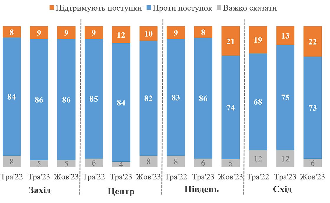 Проте, попри зазначені тенденції для мешканців Півдні та Сходу серед них усе одно переконлива більшість (74% на Півдні та 73% на Сході) виступають проти жодних територіальних поступок.