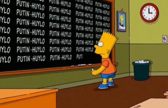При цьому Барт Сімпсон, який на початку кожної серії щось багато разів підряд пише на дошці, на цей раз написав PUTIN-HUYLO.