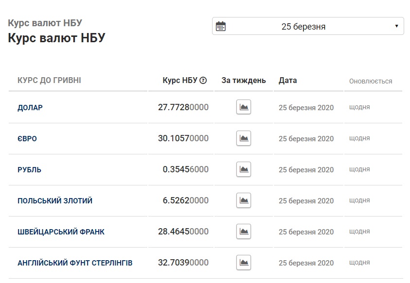 Національний банк України встановив на 25 березня 2020 офіційний курс гривні на рівні 27,7728 грн/$.