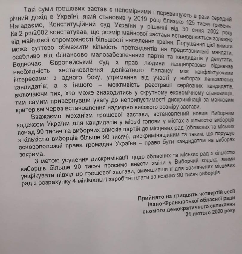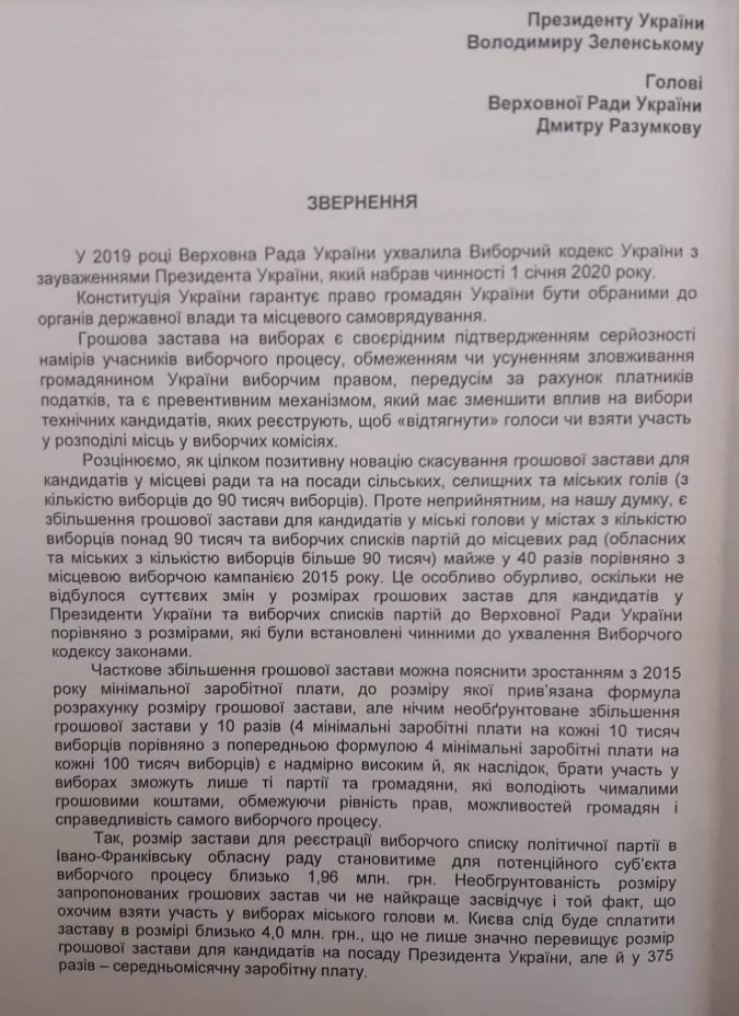 У зверненні зазначають, що збільшення грошової застави майже у 40 разів для кандидатів у міські голови в містах з кількістю виборців понад 90 тисяч в порівнянні з виборчою кампанією 2015 року є неприйнятним.