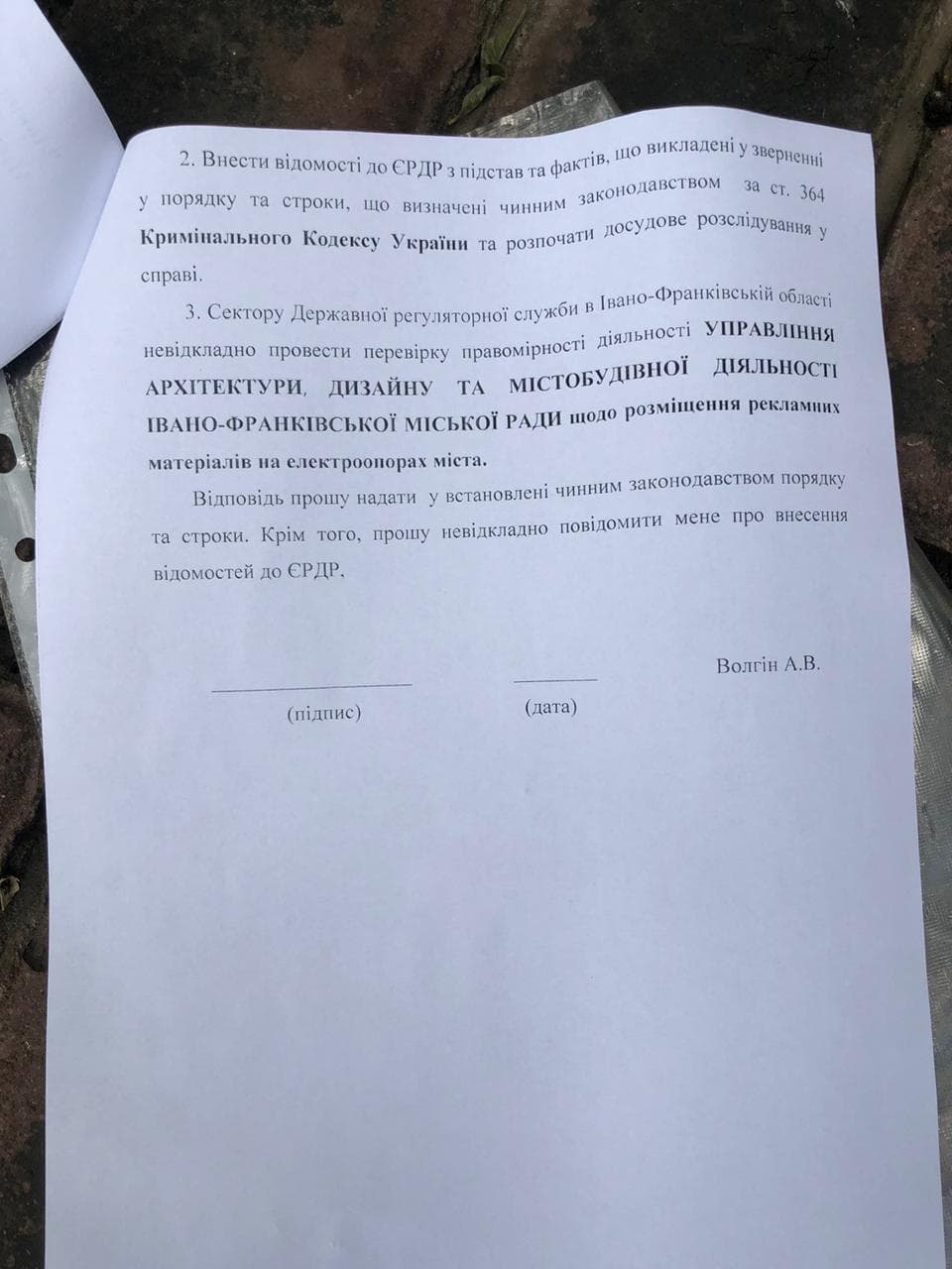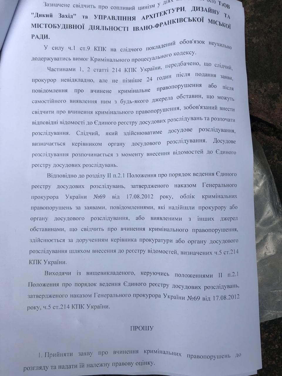 Сьогодні, він звернувся у прокуратуру Івано-Франківської області із повідомленням про вчинення кримінального правопорушення. Основним порушником у даній ситуації Андріан Волгін називає ТзОВ "Дикий Захід" та звинувачує Управління архітектури та містобудування у бездіяльності та змові з контрагентами.