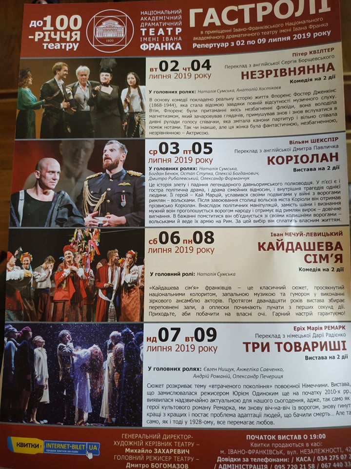 З 2 по 9 липня на сцені Івано-Франківського Національного академічного драматичного театру проходитиме гастрольний тур Київського Театру ім. Івана Франка.