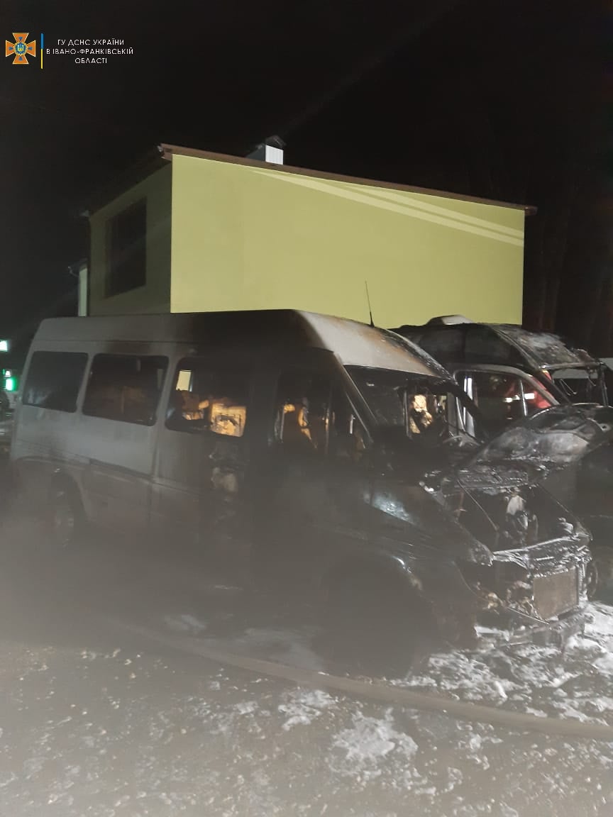 І ще три мікроавтобуси «Мерседес Спринтер» зайнялись на автомобільній стоянці у селищі Богородчани. Тут пожежа трапилась о 03.01 годині. Два транспортні засоби повністю знищено вогнем, ще один пошкоджений.