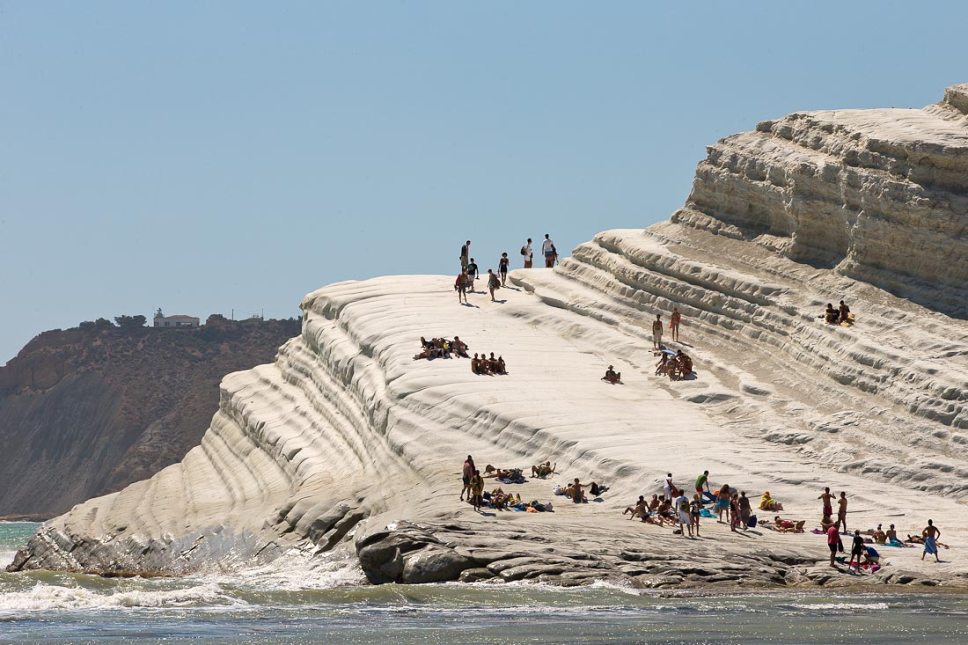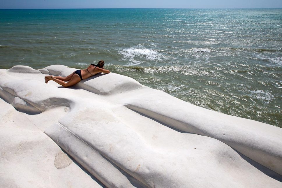 Розташований він прямо на дивовижній білій скелі, яка по-італійськи називається Scala dei Turchi (Сходи Турків). Осадова гірська порода мергель створила химерну композицію, що нагадує сходи або ряди в театральному залі. На сонці цей камінь світиться яскравим білим світлом, на який дивитися можна насилу. Поверхня гладка, обкатана вітрами і водою. Скала спускається прямо в море.