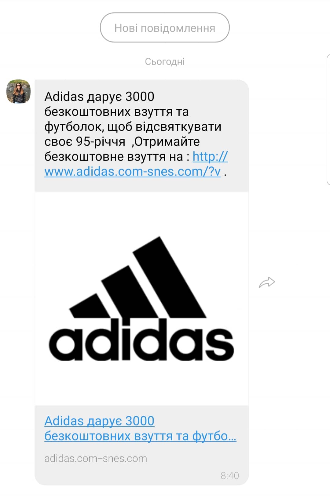 "За минулу добу мені на мобільний пристрій надійшло шість повідомленнь одного і такого ж зміст про акцію Adidas. Хоча користувачі, від яких я отримувала ці надсилання, кажуть, що нічого не відправляли. Також, вони розповідають, що перейшли за даним посиланням і після того їх друзі почали від їх імені отримувати такі ж повідомлення про акцію",-  розповідає прикарпатка Лілія Маршалко.