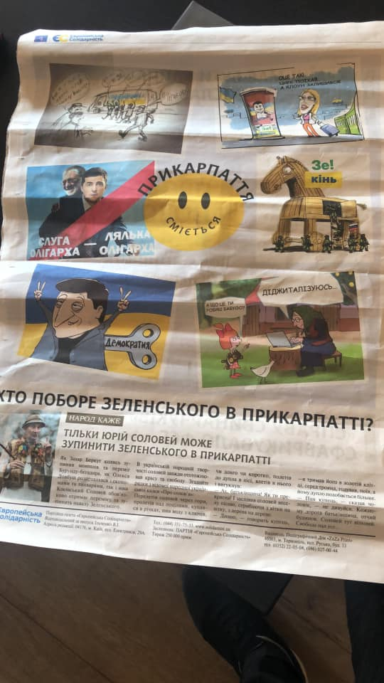 "Друзі, на брехні далеко не заїдете! Розумію, що Коломойський поклав вам завдання в любий спосіб виграти округ. Але замість того, щоб розказувати людям на що ви здатні, ви знову, як і минулого року вдаєтесь до бруду та провокацій, поширюючи брехню. Дана газетка, яка масово поширюється нібито від імені ЄС є черговим фейком. Очікую чергових сюжетів по 1+1", - написав Юрій Соловей.