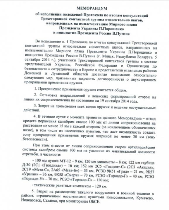На сайті ОБСЄ з'явився оригінал Меморандуму про виконання положень протоколу за підсумками консультацій Тристоронньої контактної групи, що відбулася у Мінську.