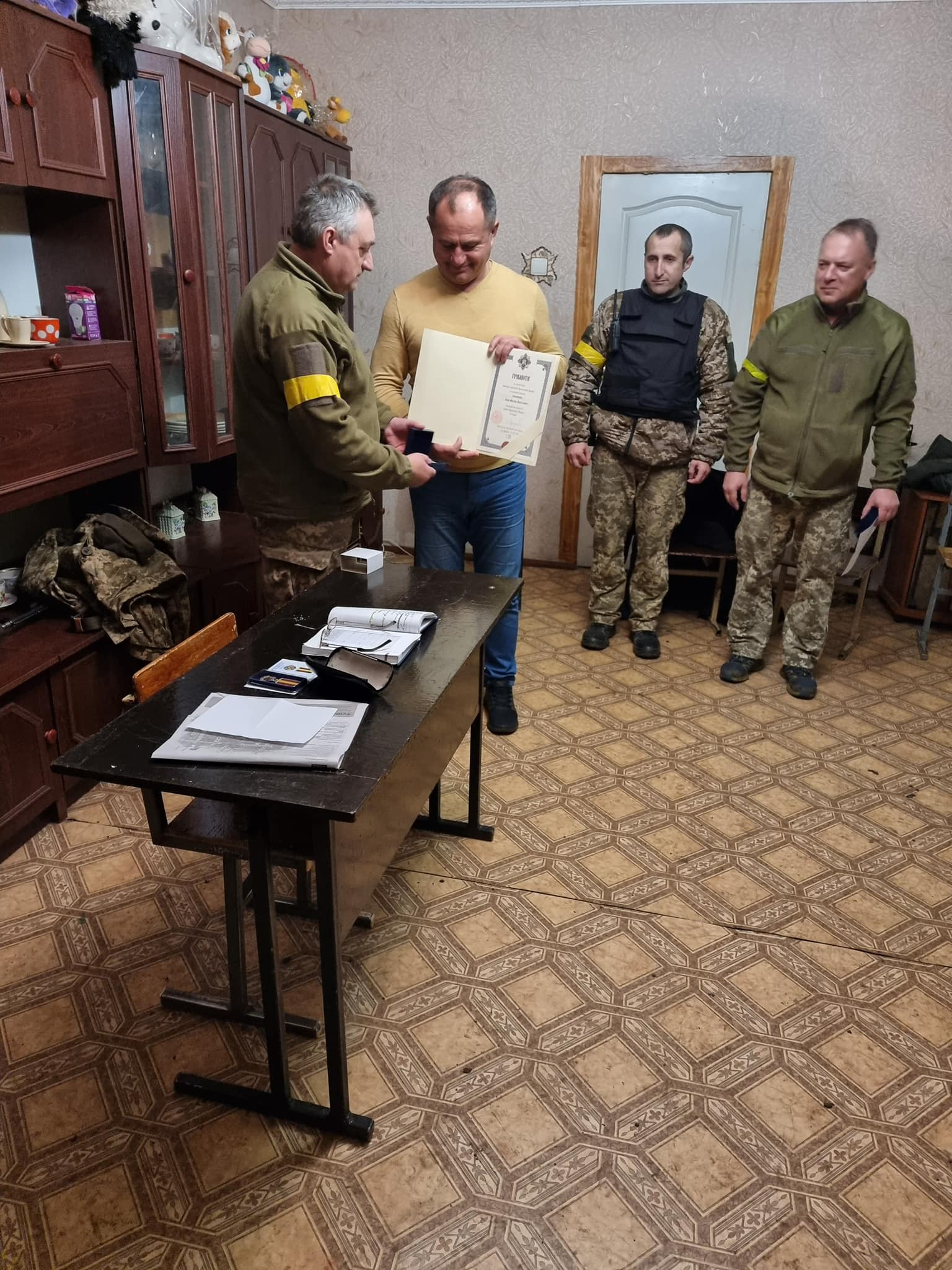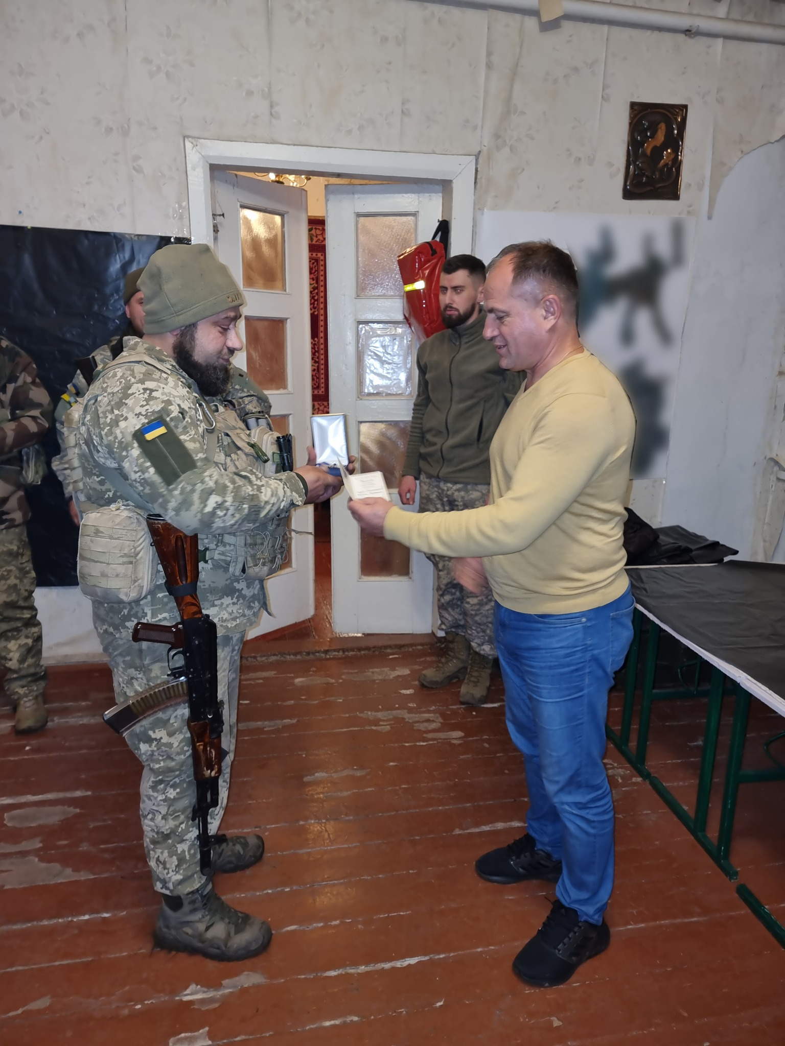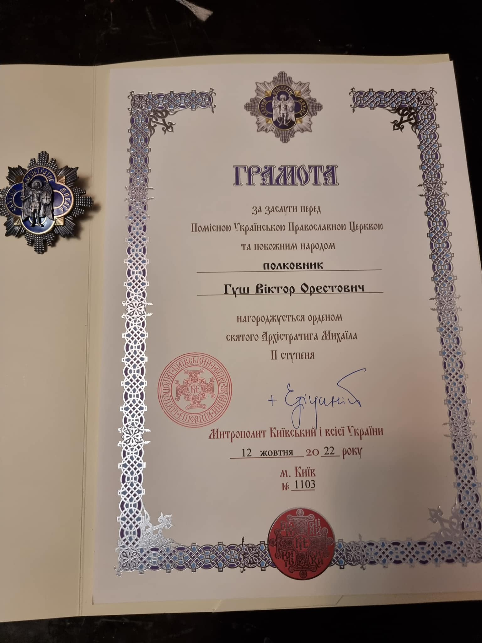 Зі слів міського голови у нього було ще одне завдання нагородити наших захисників. Вручив орден святого Архистратига Михаїла II ступеня від Митрополита ПЦУ Епіфанія та медалі за бойові заслуги полковнику Віктору Гушу.